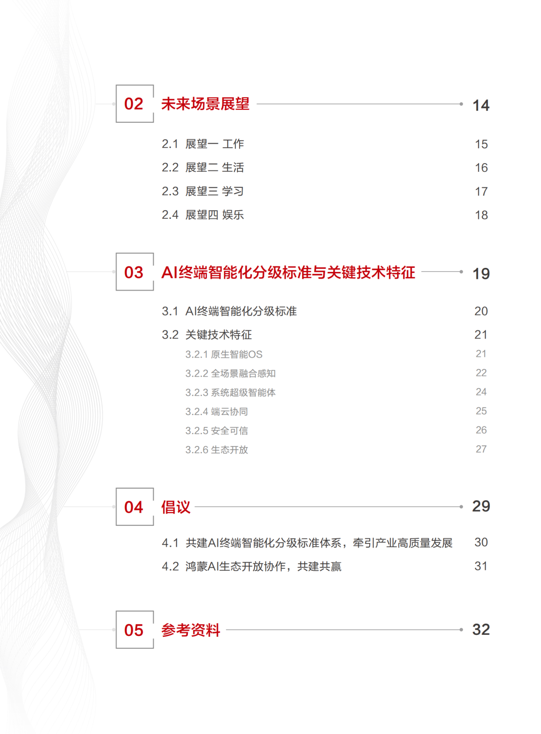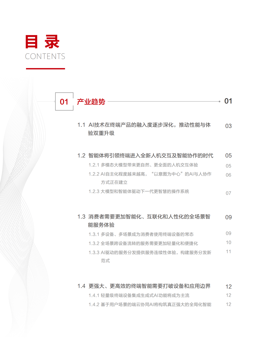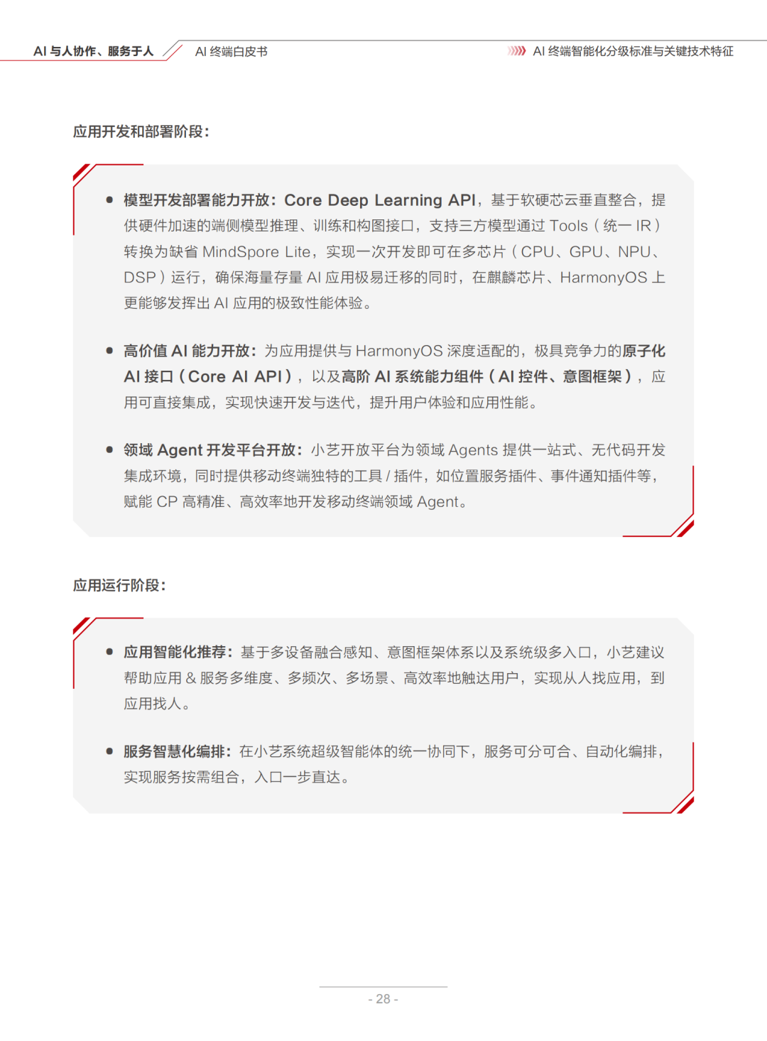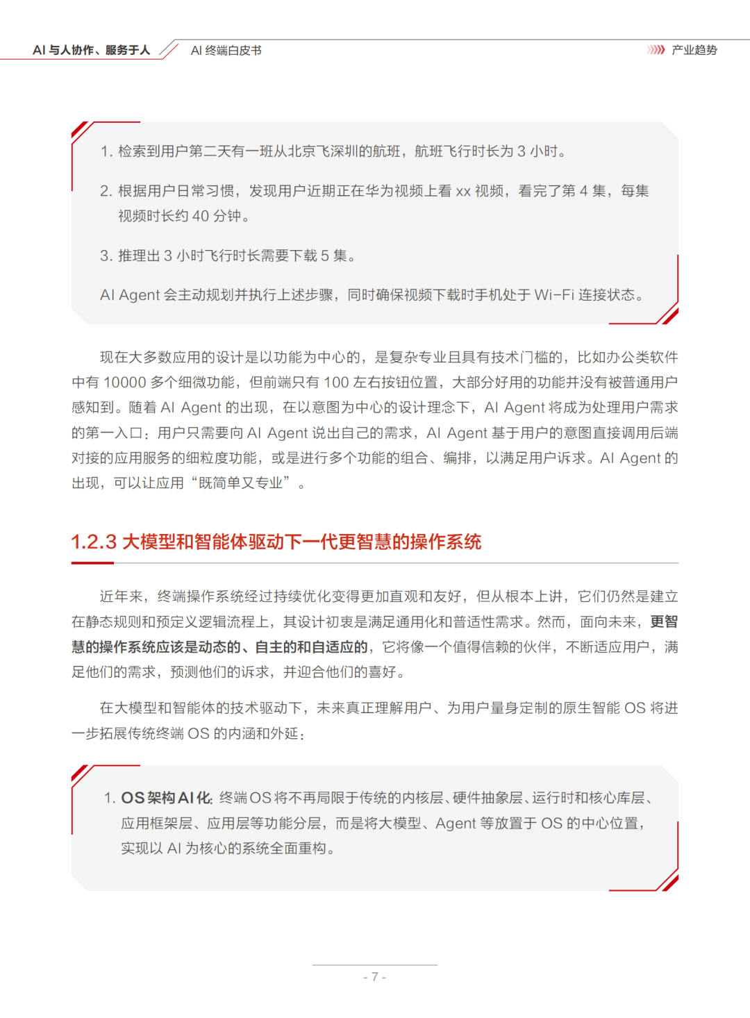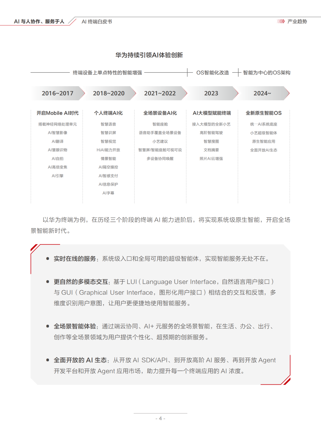这份《AI 终端白皮书》由华为联合清华大学发布,核心秉持AI 与人协作、服务于人的技术理念,立足体验为王的时代背景,深度分析 AI 终端的产业趋势、未来场景、智能化分级标准与核心技术,并提出产业发展倡议,旨在推动 AI 大模型与终端产品深度融合,构建全场景智慧生活体验,引领 AI 终端产业标准化、高质量发展。AI 技术融入终端逐步深化:历经应用层集成 AI(单点智能增强)、系统层融合 AI(AI