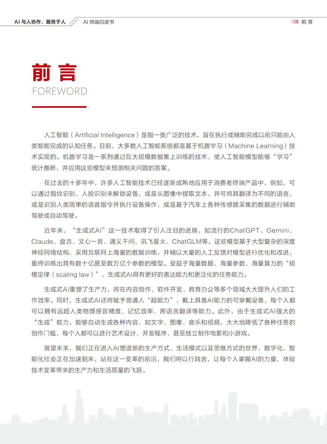 这份《AI 终端白皮书》由华为联合清华大学发布,核心秉持AI 与人协作、服务于人的技术理念,立足体验为王的时代背景,深度分析 AI 终端的产业趋势、未来场景、智能化分级标准与核心技术,并提出产业发展倡议,旨在推动 AI 大模型与终端产品深度融合,构建全场景智慧生活体验,引领 AI 终端产业标准化、高质量发展。以下是核心内容总结: