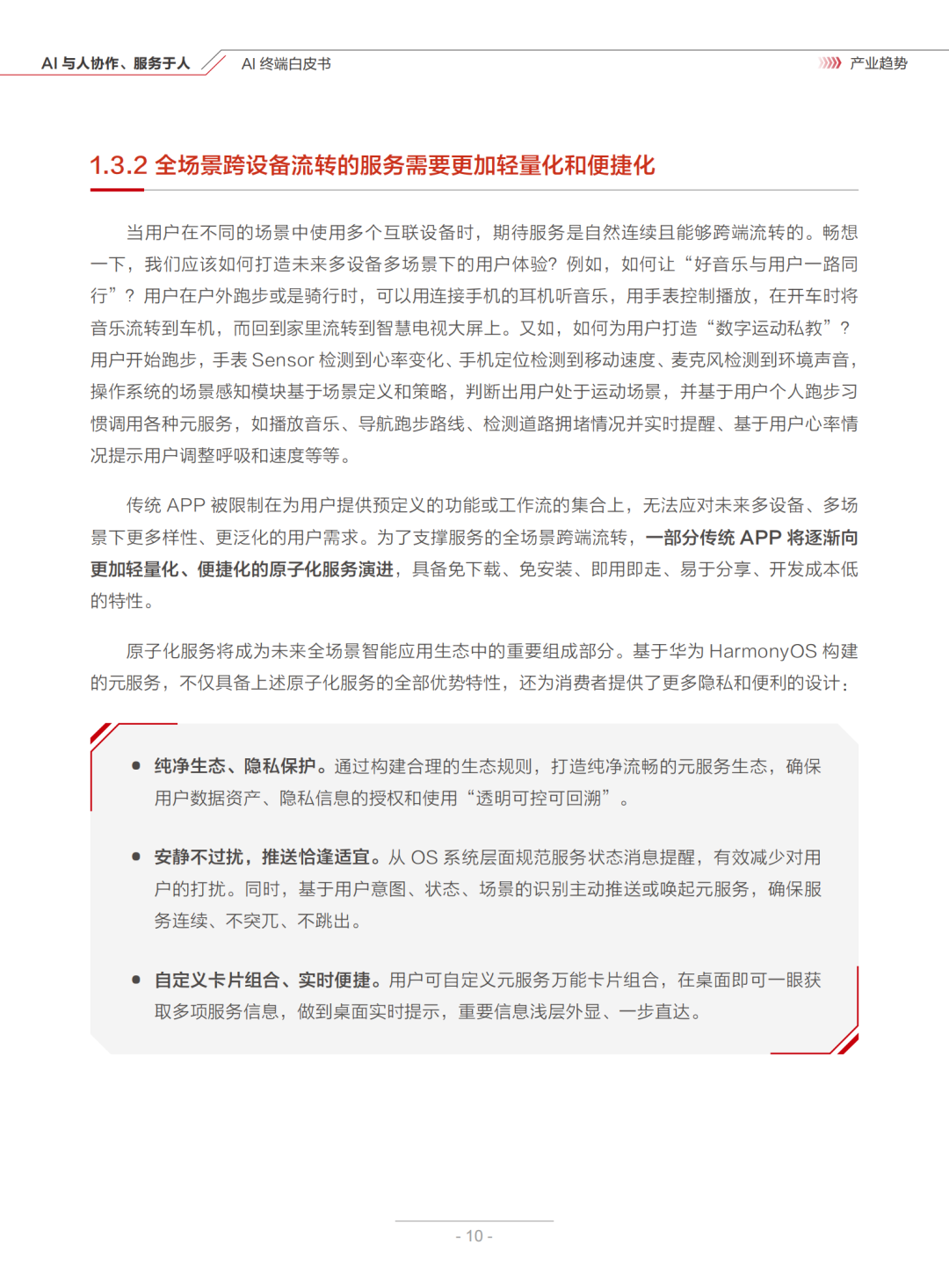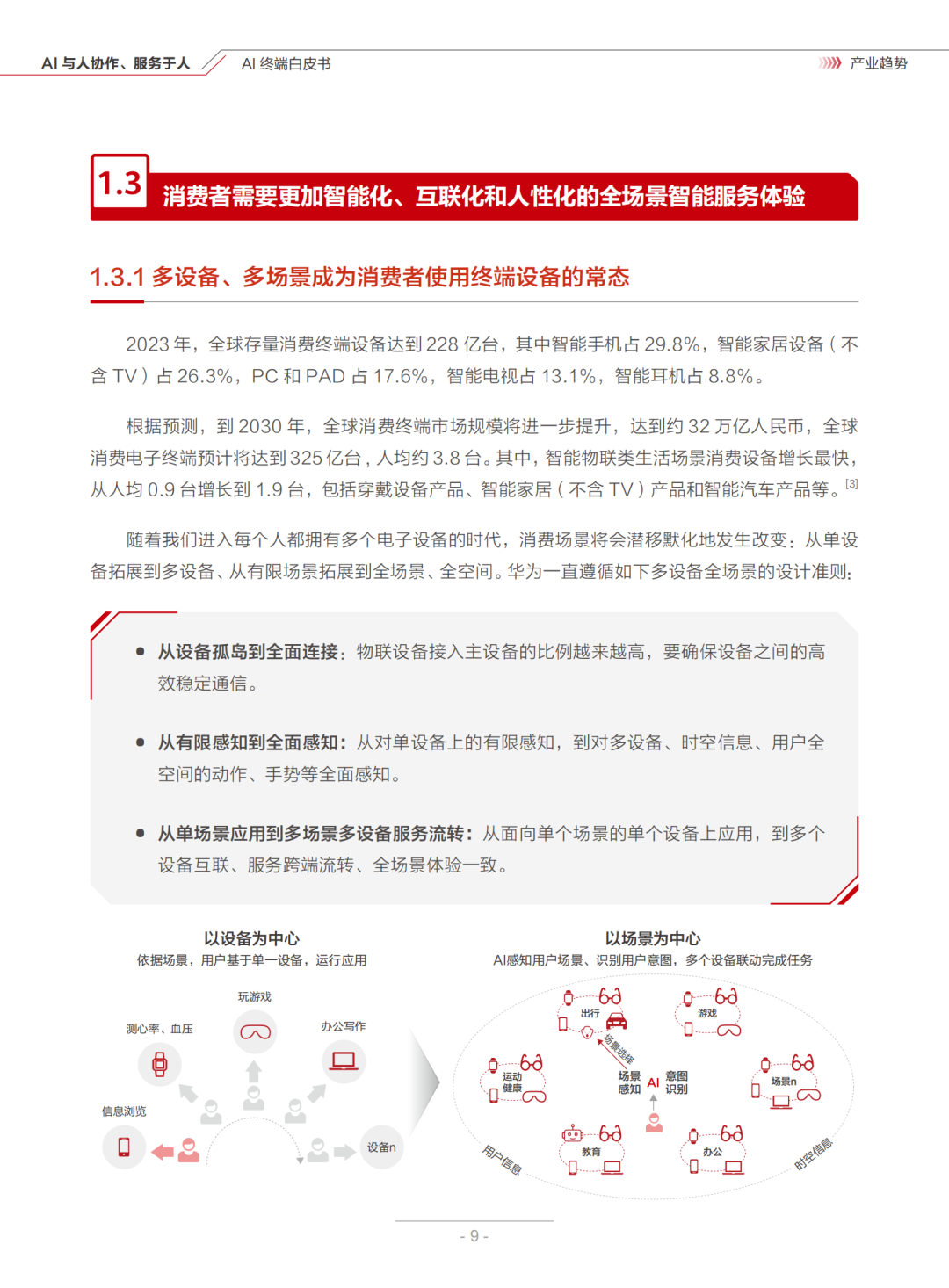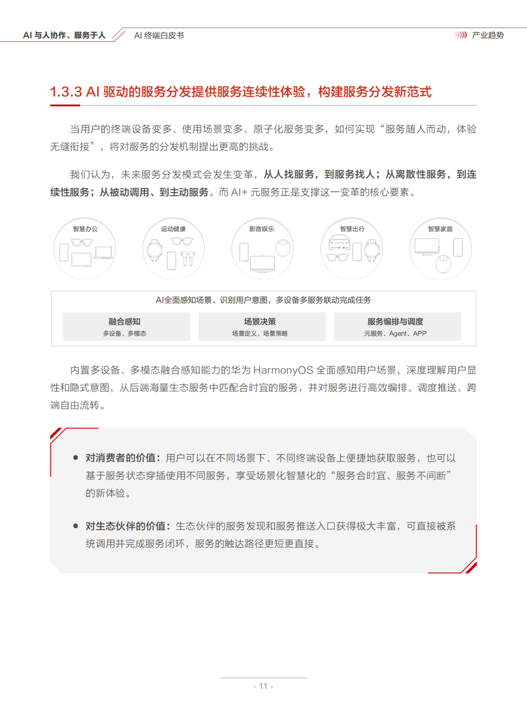 消费者需求转向全场景智能服务:多设备、多场景成为使用常态,要求服务实现跨端轻量化流转;AI 驱动服务分发从 “人找服务” 转向 “服务找人”,构建连续、主动的服务新范式。
