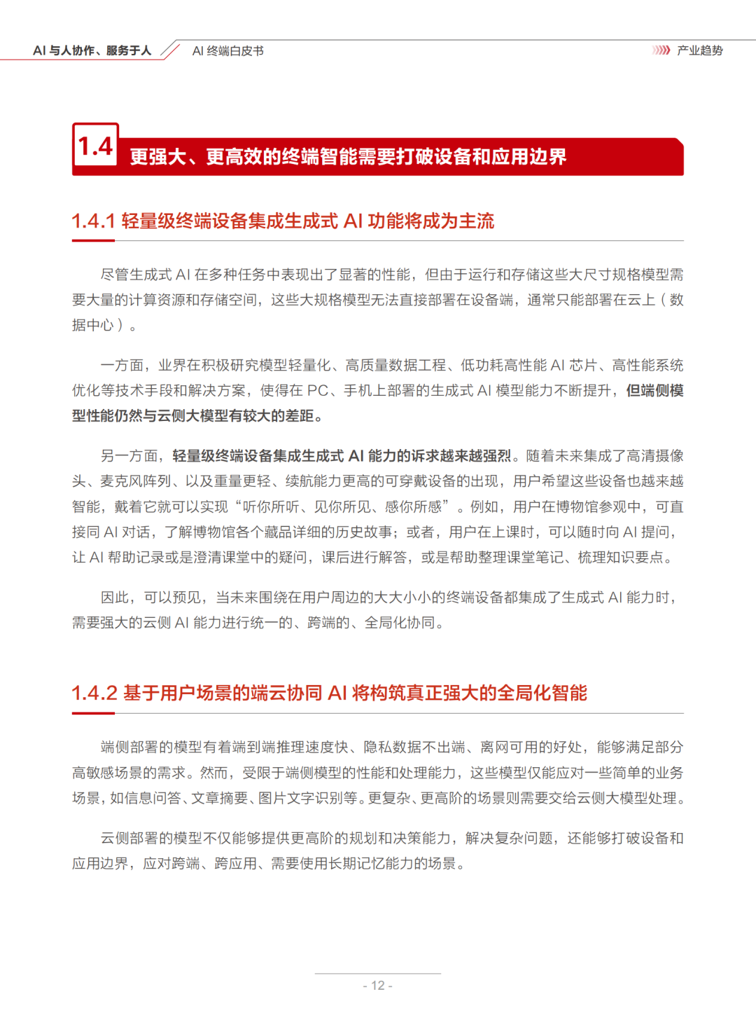 终端智能打破设备与应用边界:轻量级终端集成生成式 AI 成主流,端云协同成为关键 —— 端侧模型满足隐私、极速、离网需求,云侧模型处理复杂、跨端场景,二者结合构筑全局化智能。