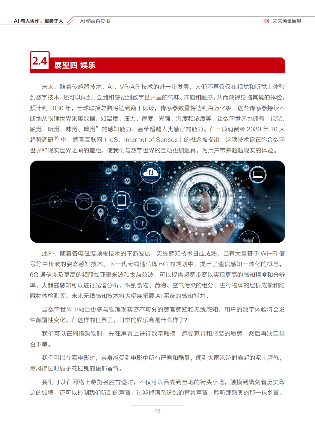 娱乐:传感器、AI、VR/AR 及 6G 通信感知一体化技术推动感官互联网发展,让数字体验融合视、听、触、嗅、味,实现沉浸式、超越现实的娱乐体验。