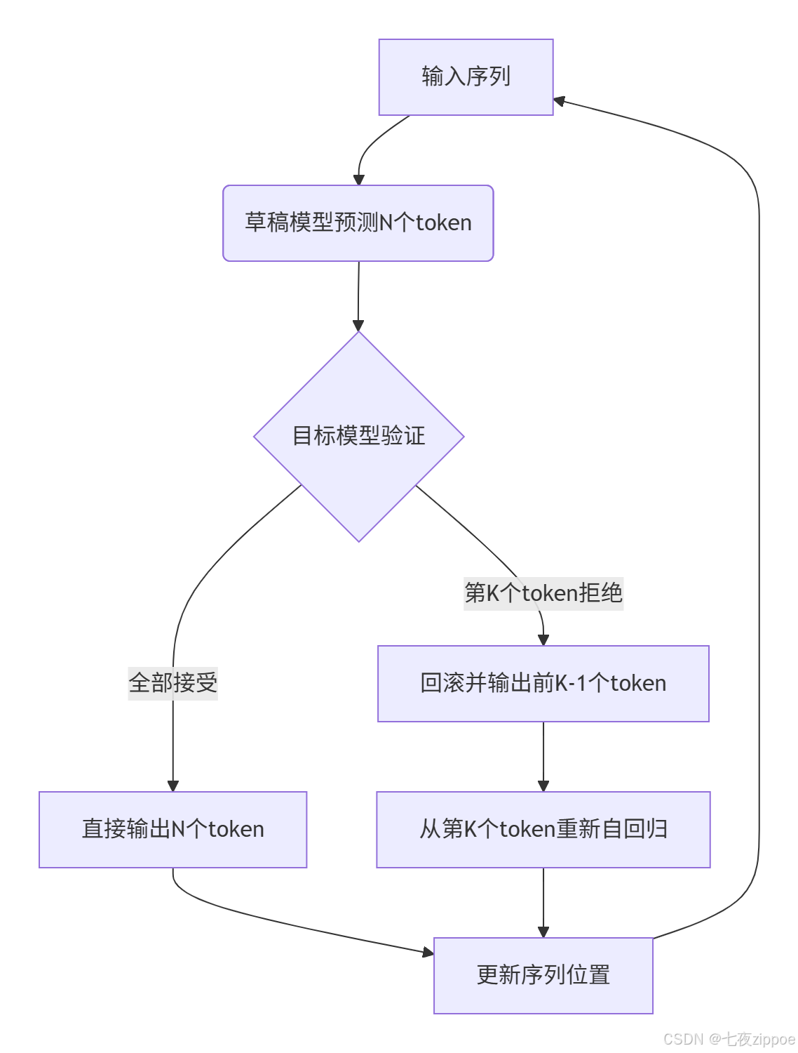草稿模型 (Draft Model):轻量级模型,快速生成候选token序列(比如一次生成5个token)。