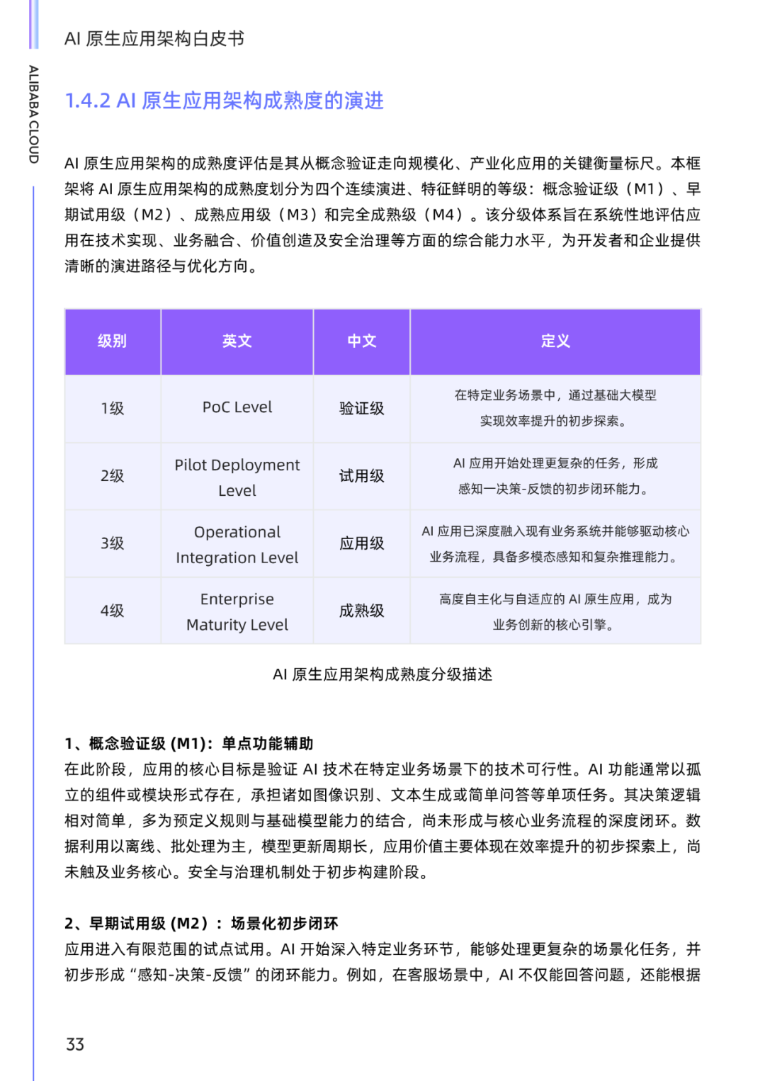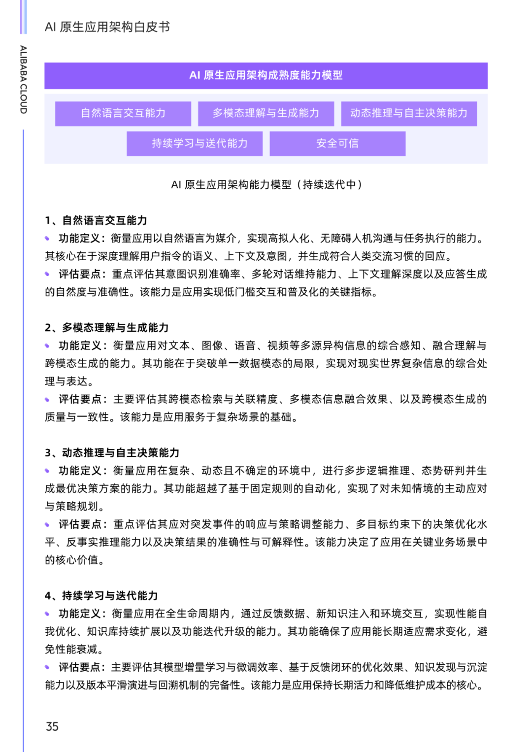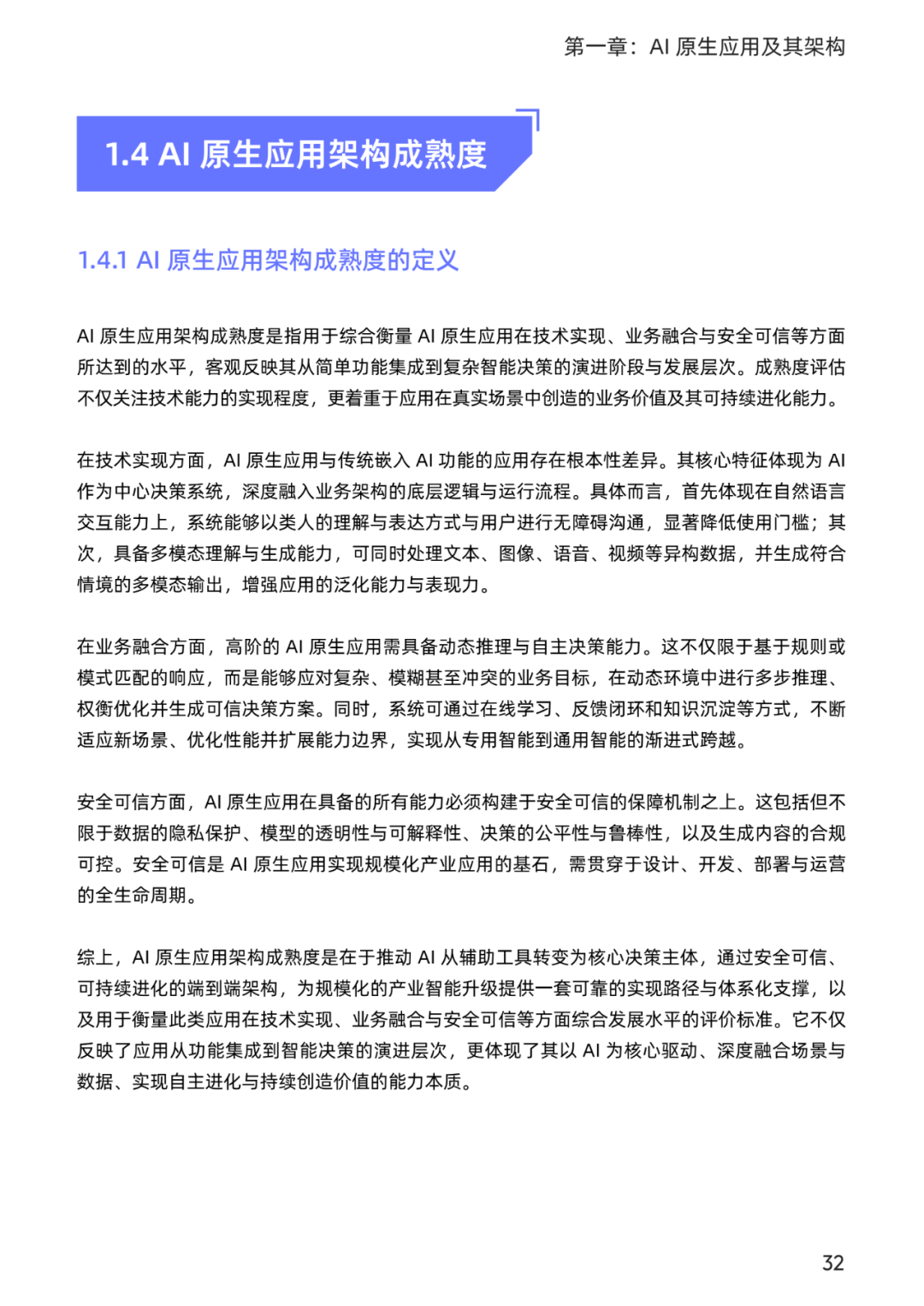 从大模型技术发展的回顾开始,正因为其技术上的突破,带来了应用上的繁荣,并对应用架构的演进历程进行了梳理,对 AI 原生应用需要具备的核心能力给出了解释,以及定义了 AI 原生应用架构成熟度,作为企业综合衡量 AI 原生应用在技术实现、业务融合与安全可信等方面所达到的水平的一个参考标准。