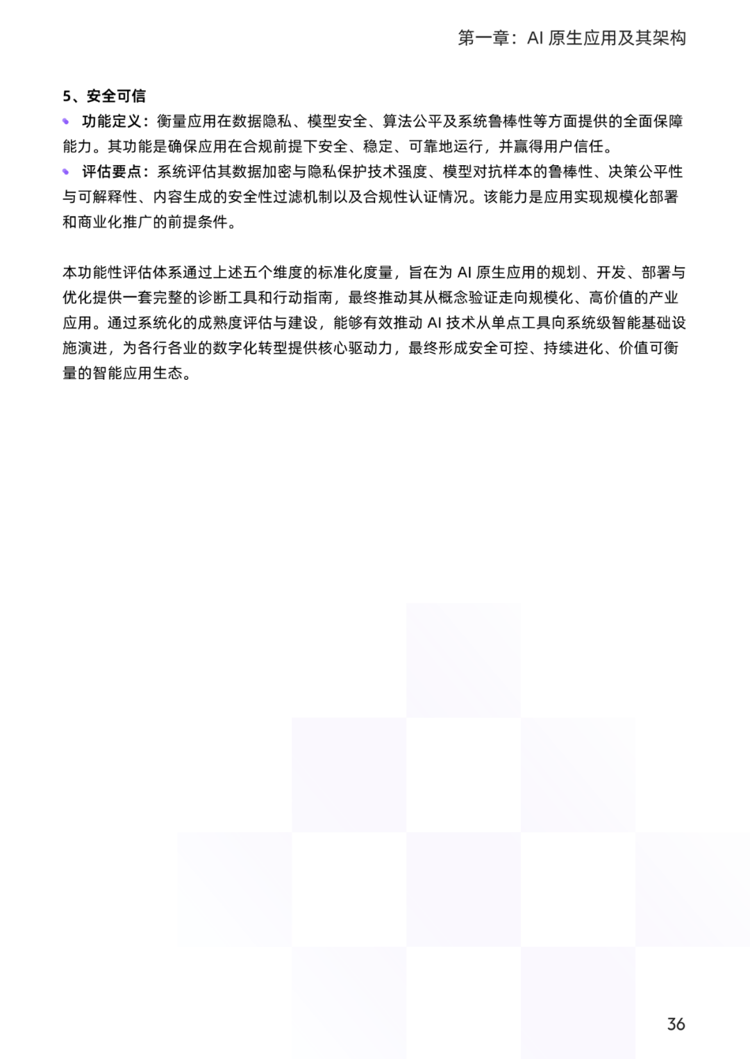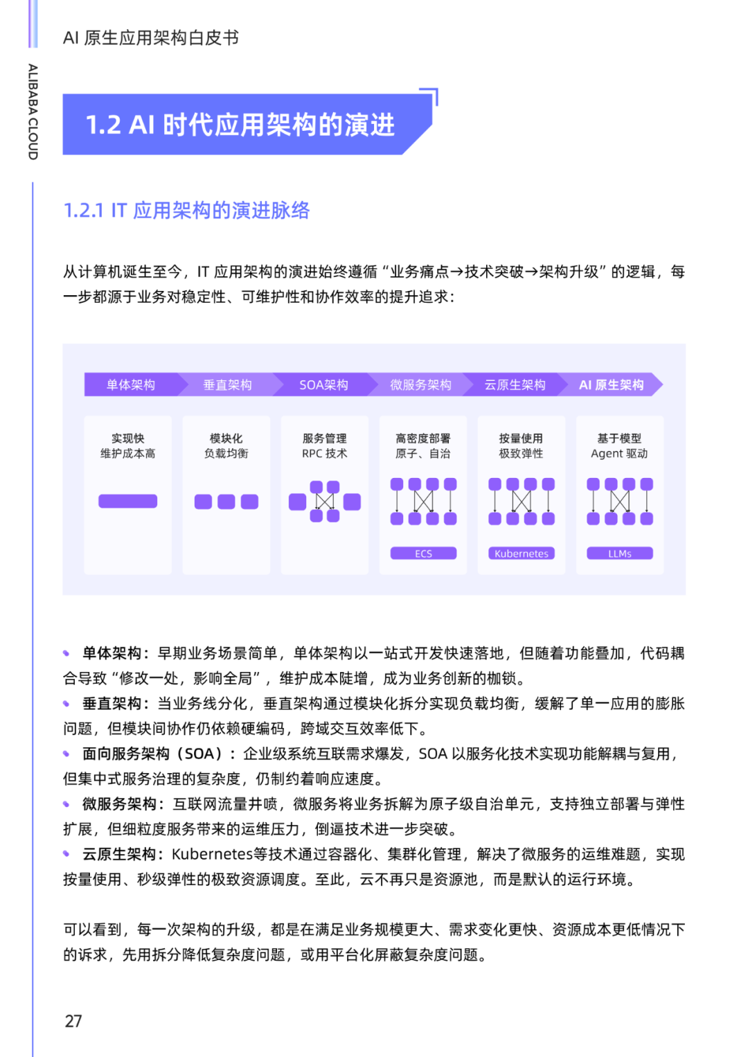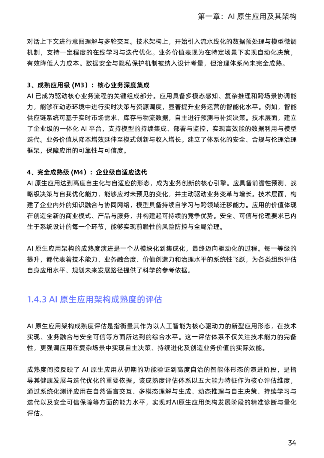 从大模型技术发展的回顾开始,正因为其技术上的突破,带来了应用上的繁荣,并对应用架构的演进历程进行了梳理,对 AI 原生应用需要具备的核心能力给出了解释,以及定义了 AI 原生应用架构成熟度,作为企业综合衡量 AI 原生应用在技术实现、业务融合与安全可信等方面所达到的水平的一个参考标准。