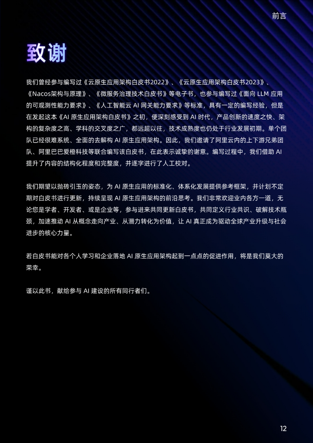 我们曾经参与编写过《云原生应用架构白皮书2022》、《云原生应用架构白皮书2023》、《Nacos 架构与原理》、《微服务治理技术白皮书》等电子书,也参与编写过《面向 LLM 应用的可观测性能力要求》、《人工智能云 AI 网关能力要求》等标准,具有一定的编写经验。但是在发起这本《AI 原生应用架构白皮书》之初,便深刻感受到 AI 时代,产品创新的速度之快、架构的复杂度之高、学科的交叉度之广,都远超以往,技术成熟度也仍处于行业发展初期。单个团队已经很难系统、全面的去解构 AI 原生应用架构。因此,我们邀请了阿里云内的上下游兄弟团队、阿里巴巴爱橙科技等联合编写该白皮书,在此表示诚挚的谢意。编写过程中,我们借助 AI 提升了内容的结构化程度和完整度,并逐字进行了人工校对。