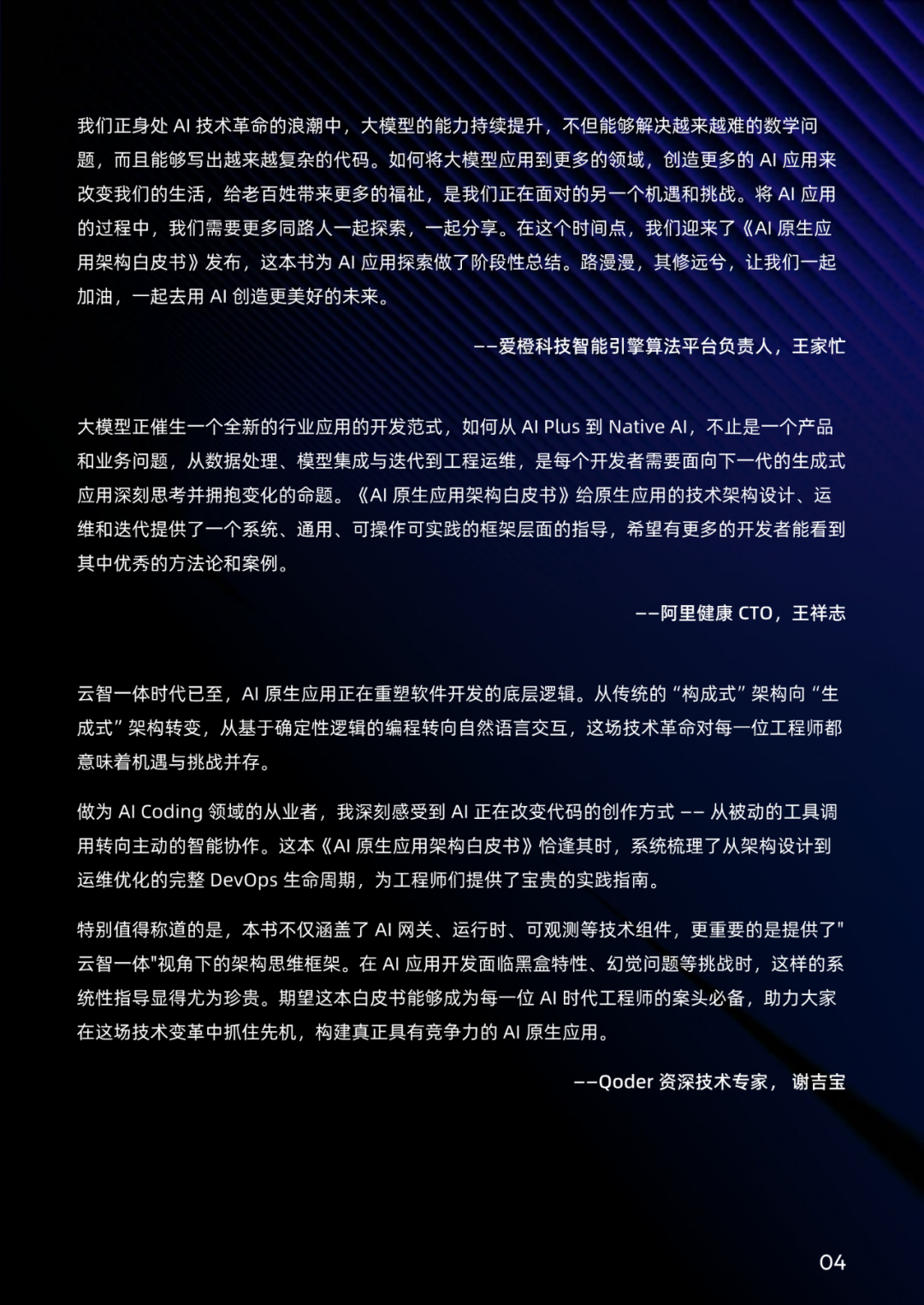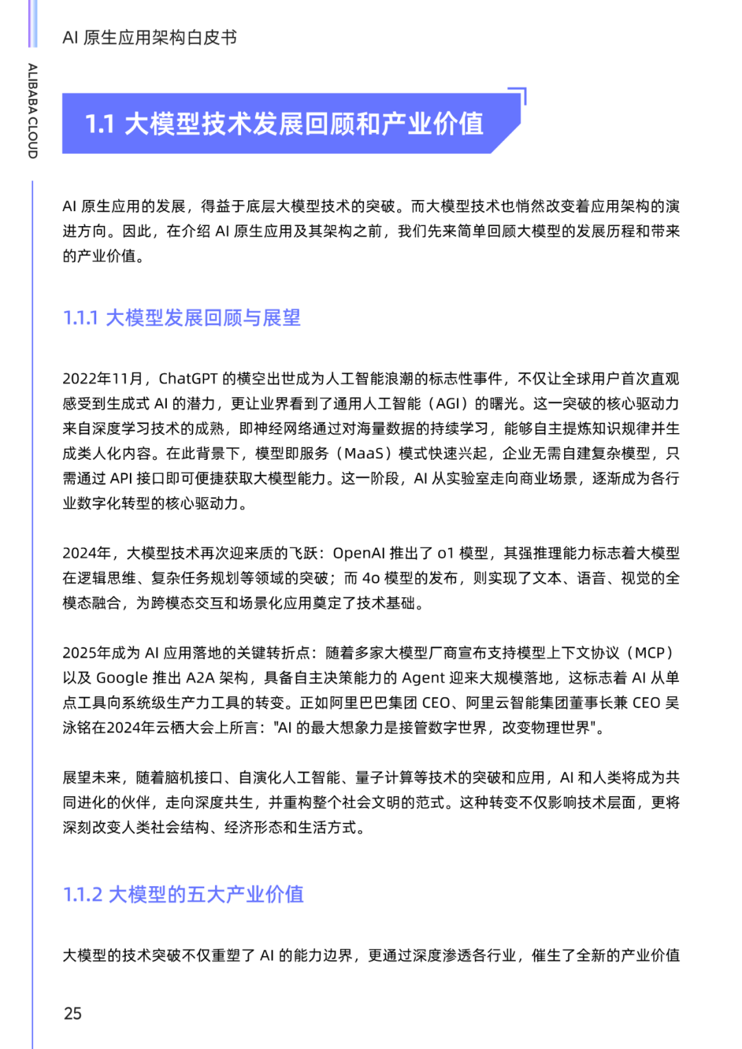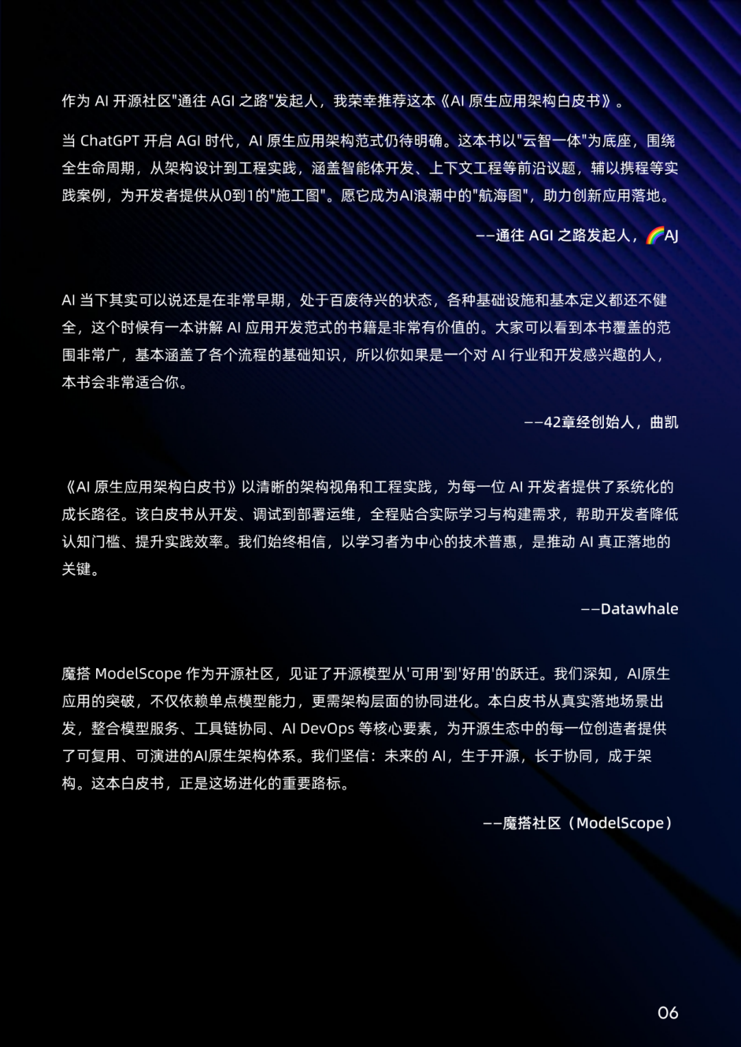 我们期望以抛砖引玉的姿态,为 AI 原生应用的标准化、体系化发展提供参考框架,并计划不定期对白皮书进行更新,持续呈现 AI 原生应用架构的前沿思考。我们非常欢迎业内各方一道,无论您是学者、开发者、或是用户等,参与进来共同更新白皮书,共同定义行业共识、破解技术瓶颈,加速推动 AI 从概念走向产业、从潜力转化为价值,让 AI 真正成为驱动全球产业升级与社会进步的核心力量。