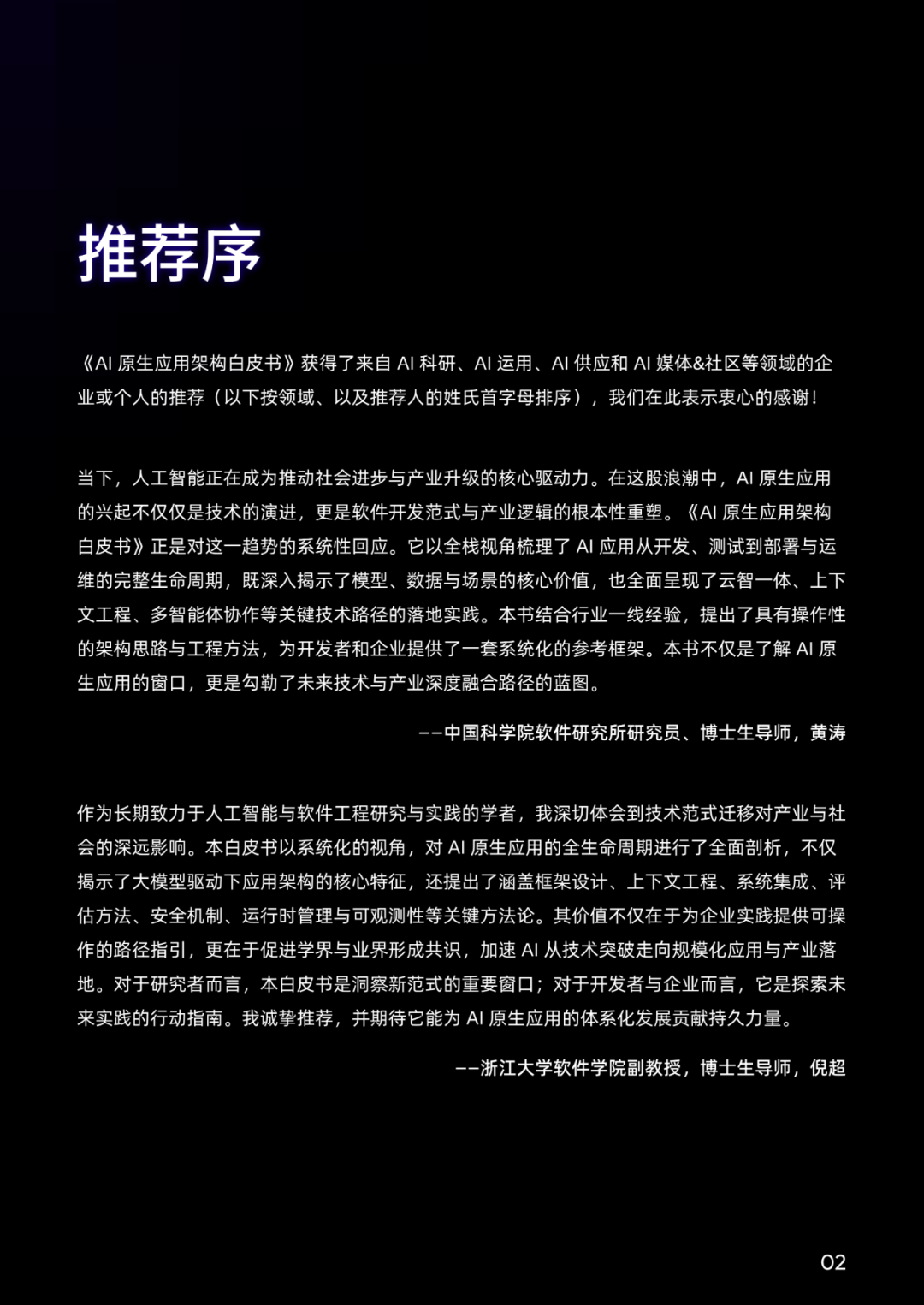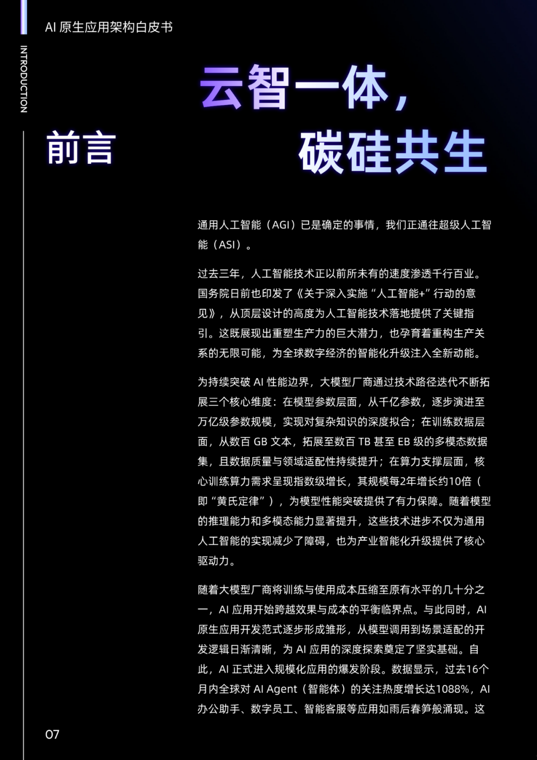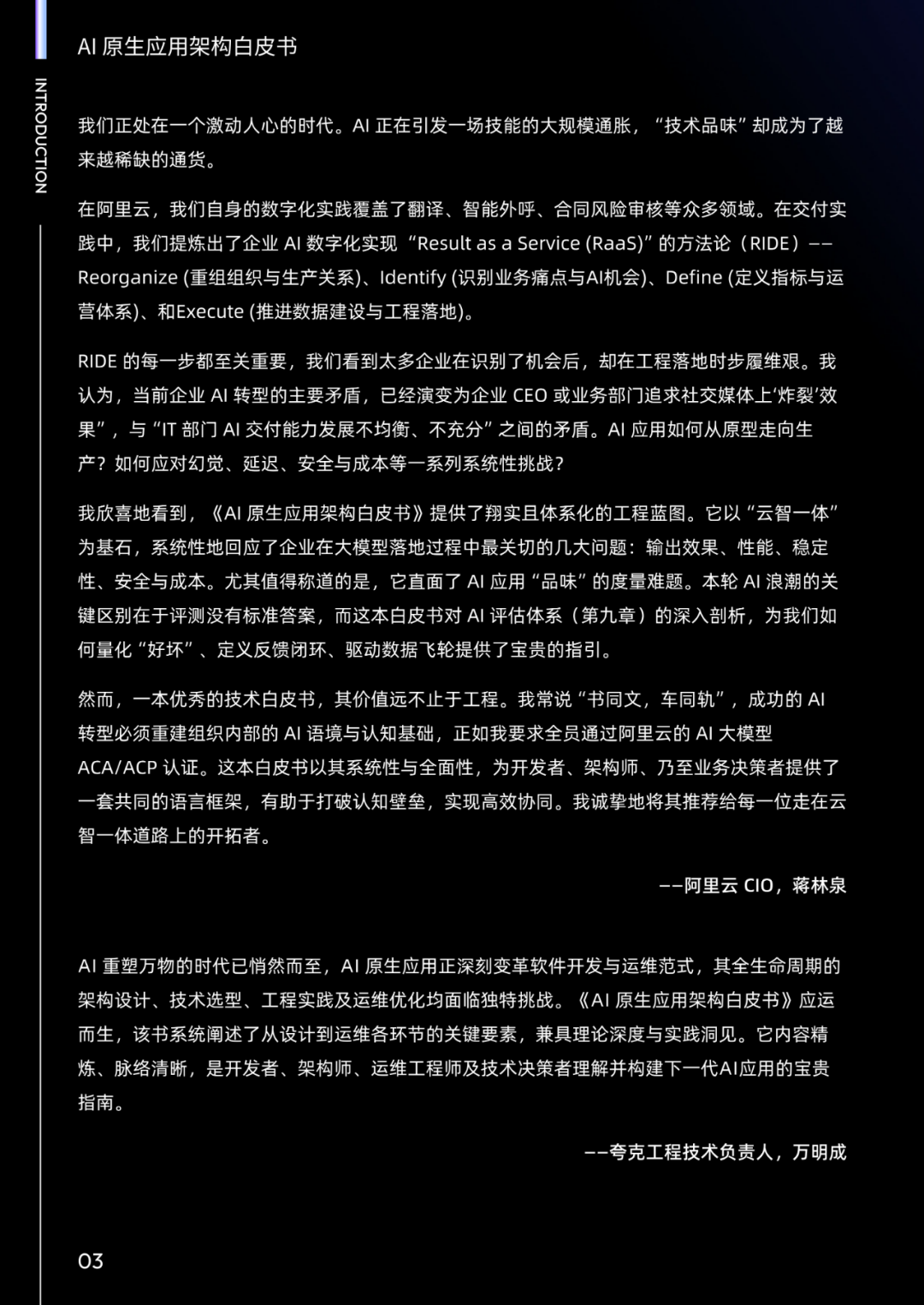 我们期望以抛砖引玉的姿态,为 AI 原生应用的标准化、体系化发展提供参考框架,并计划不定期对白皮书进行更新,持续呈现 AI 原生应用架构的前沿思考。我们非常欢迎业内各方一道,无论您是学者、开发者、或是用户等,参与进来共同更新白皮书,共同定义行业共识、破解技术瓶颈,加速推动 AI 从概念走向产业、从潜力转化为价值,让 AI 真正成为驱动全球产业升级与社会进步的核心力量。