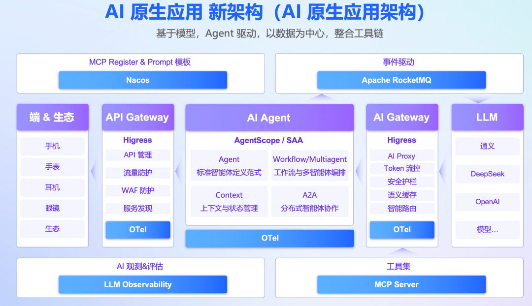 应用架构是指导如何系统性地构建应用。在 AI 原生应用架构下,其目标是在满足可扩展、可观测、安全合规的同时,最大化释放大模型的智能潜力。以下是典型的 AI 原生应用架构,涵盖了模型、应用开发框架、提示词、RAG、记忆、工具、网关、运行时、可观测、评估和安全等关键要素。