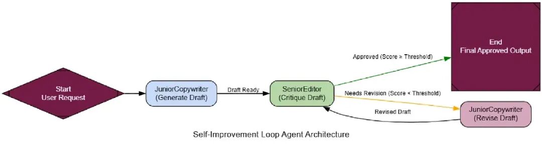 - Long-Term Learning: 一旦策略选择,一个“Junior Copywriter”代理用Generate → Critique → Refine循环迭代起草内容。活动性能、参与指标、转化然后反馈到Self-Improvement Loop,创建一个金标准数据集,改进系统未来任务的表现。