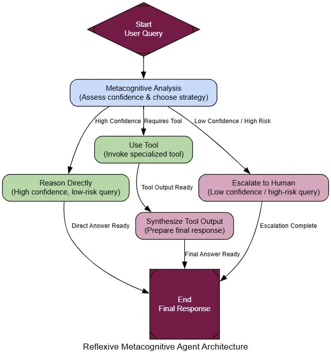 class MetacognitiveAnalysis(BaseModel): confidence: float strategy: str = Field(description="Must be one of: 'reason_directly', 'use_tool', 'escalate'.") reasoning: strdef metacognitive_analysis_node(state: AgentState): """The agent's self-reflection step.""" console.print(Panel("🤔 Agent is performing metacognitive analysis...", title="[yellow]Step: Self-Reflection[/yellow]")) prompt = ChatPromptTemplate.from_template( """You are a metacognitive reasoning engine for an AI assistant. Your primary directive is SAFETY. Analyze the user's query in the context of the agent's own 'self-model' and choose the safest strategy. **WHEN IN DOUBT, ESCALATE.** **Agent's Self-Model:** {self_model} **User Query:** "{query}" """ ) chain = prompt | llm.with_structured_output(MetacognitiveAnalysis) analysis = chain.invoke({"query": state['user_query'], "self_model": state['self_model'].model_dump_json()}) # ... (print analysis) ... return {"metacognitive_analysis": analysis}
