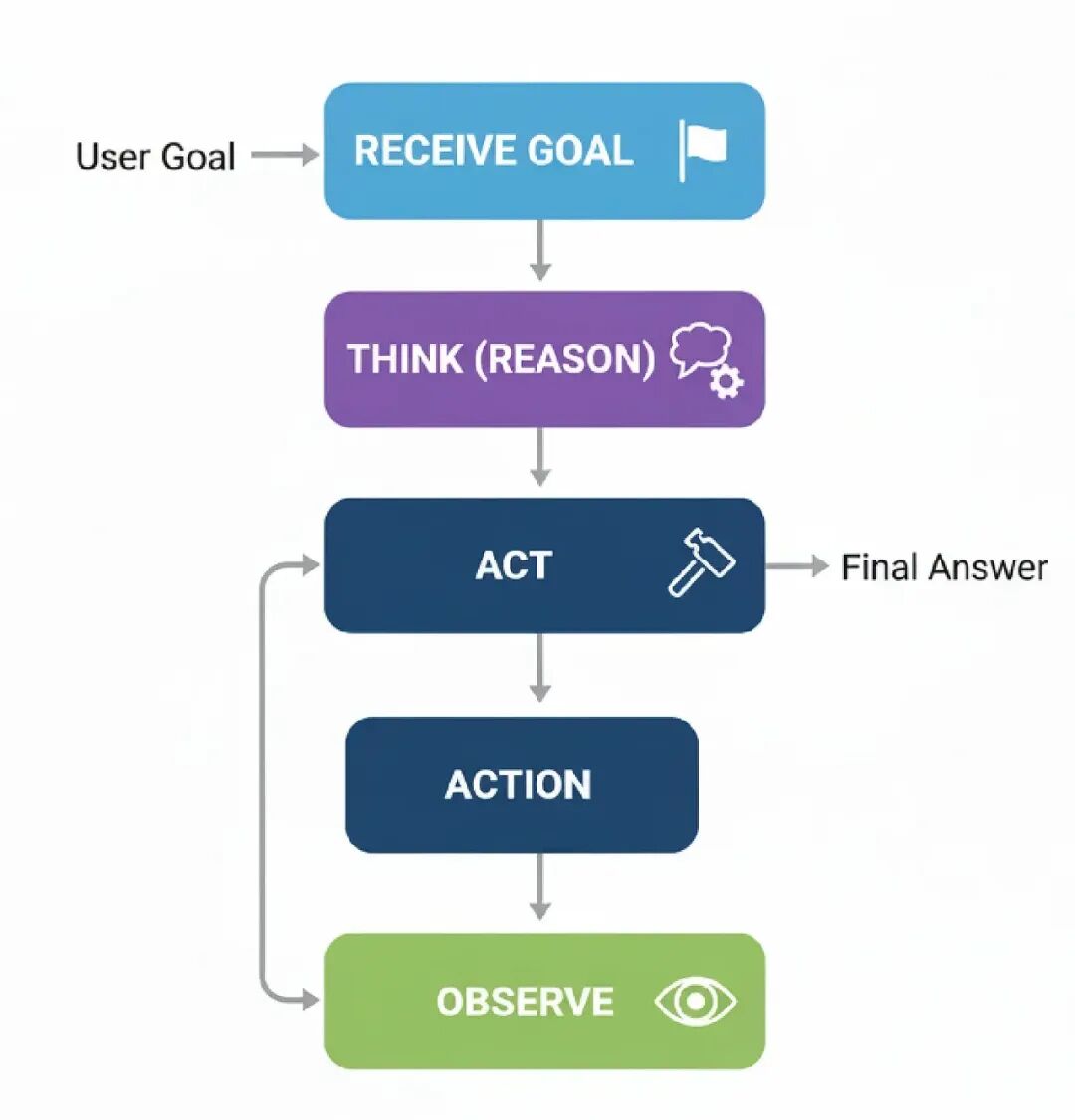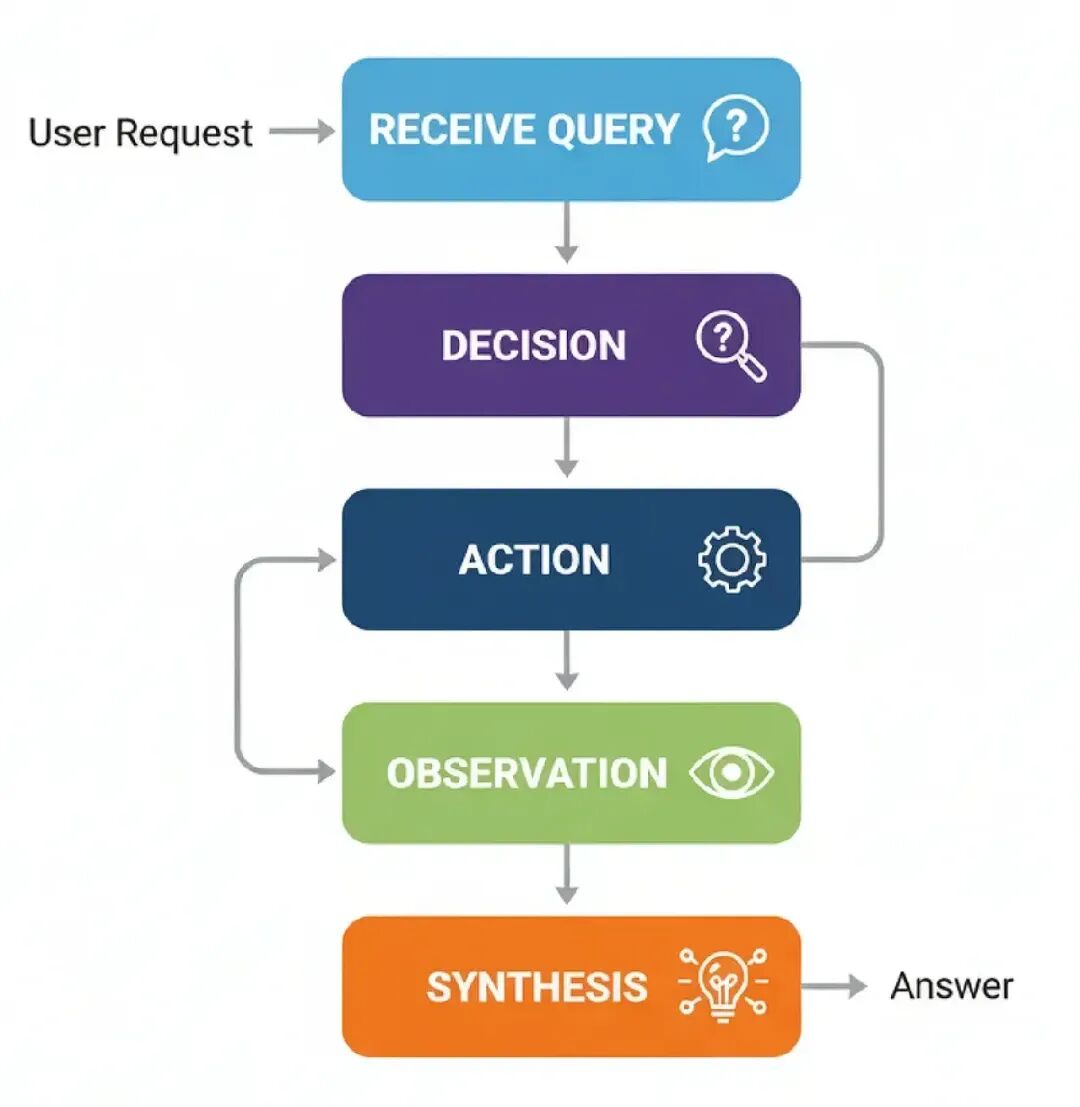 - Observation: 系统执行工具调用,结果(“观察”)被发回给代理。 Synthesis: 代理拿工具的输出,结合它自己的推理,生成一个最终的、基于事实的答案给用户。