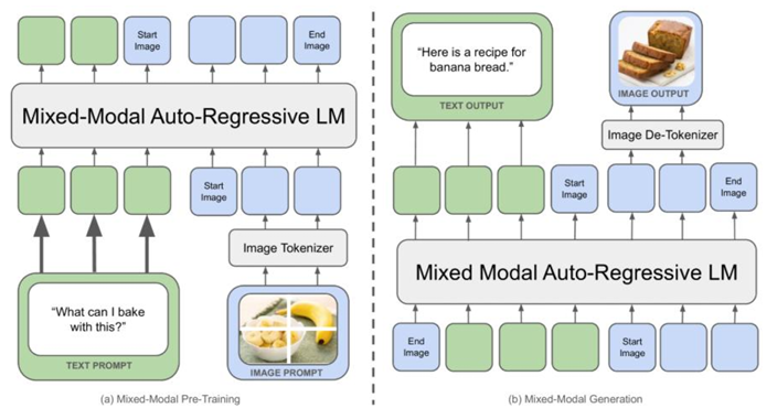 2024年5月Meta AI发布的Chameleon是这一阶段的开创性工作。它大胆地提出了一种早期融合(Early-fusion)的思路。与此前主流的“晚期融合”(即先分别编码再连接)不同Chameleon在模型的最底层就将图像和文本转换为统一的离散Token序列然后将这些混合模态的Token序列直接输入到一个标准的、仅包含解码器(Decoder-only)的LLM中进行处理。这种设计的优势在于它最大程度地保留了LLM的原始架构理论上可以实现更深层次的模态交互。
