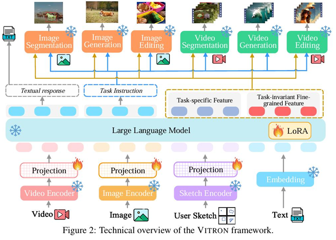 几乎在同一时期来自昆仑万维、新加坡国立大学、新加坡南洋理工大学团队的研究者们发布了VITRON提出了另一种统一建模的思路。VITRON的核心是统一的像素级视觉表示。