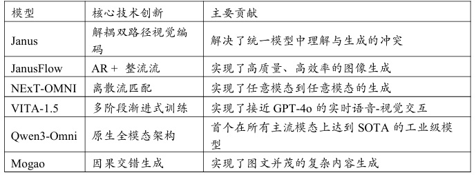 综上所述,2025年是多模态大语言模型技术发展史上承前启后、全面爆发的一年。在这一年里模型架构、生成范式和交互体验都迈上了新的台阶。解耦设计解决了核心的性能瓶颈流模型提供了更优的生成方案而实时交互和原生全模态的实现则宣告了“全能AI助手”时代的曙光。