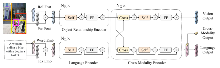 以LXMERT为例其架构包含一个对象关系编码器(基于Faster R-CNN提取的区域特征)、一个语言编码器和一个跨模态编码器。这种设计允许模型在融合前对每个模态进行独立的上下文建模。