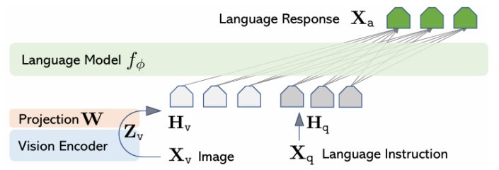 特征对齐阶段: 使用简单的图文对数据训练一个线性投影层将CLIP视觉编码器的输出映射到LLM的词嵌入空间实现初步的模态对齐。