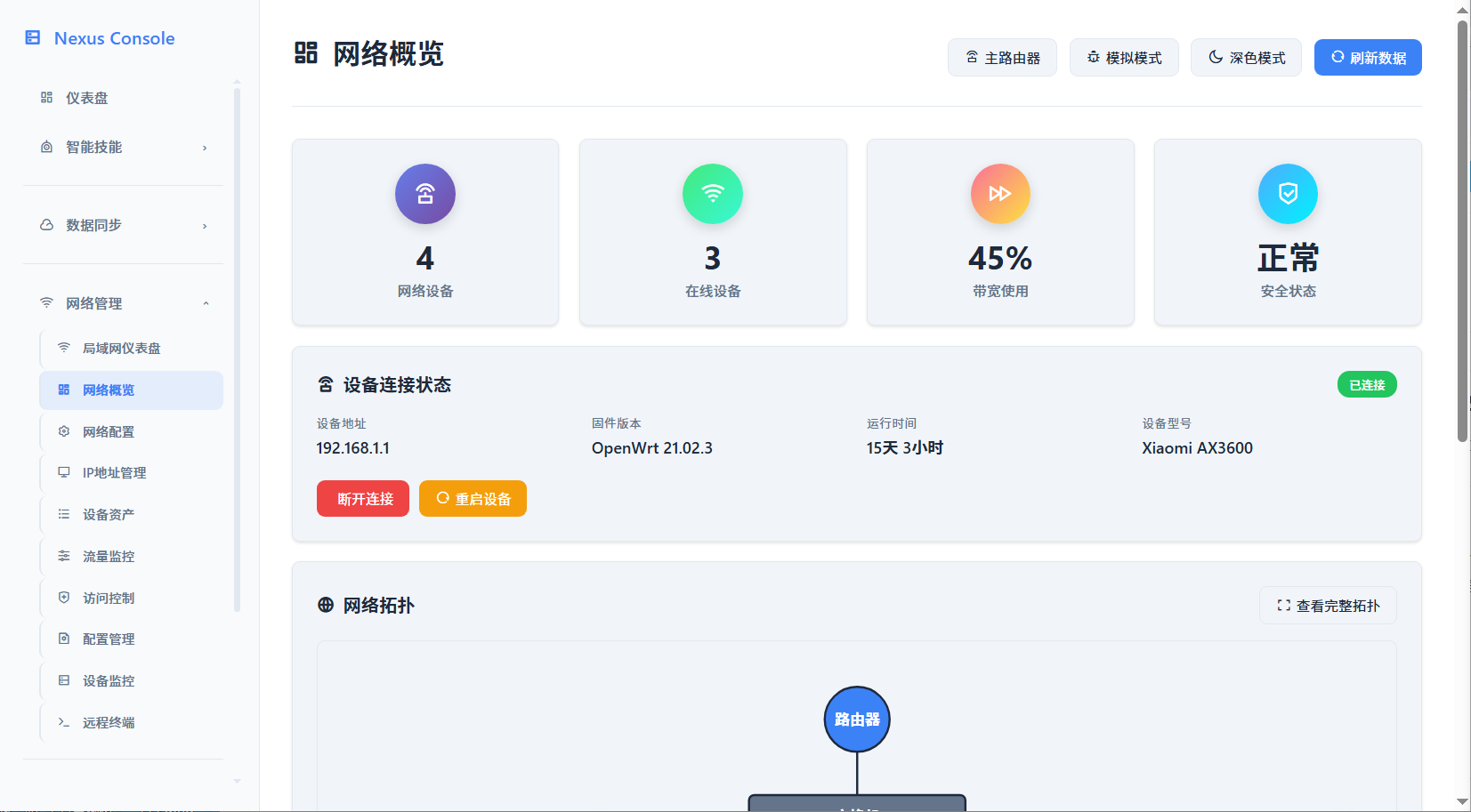 ooderNexus 是一个有潜力的开源项目,OpenWrt 集成和存储管理功能已经相当成熟。虽然 P2P 网络和 AI 技能功能还在开发中,但基础框架已经搭建完成。