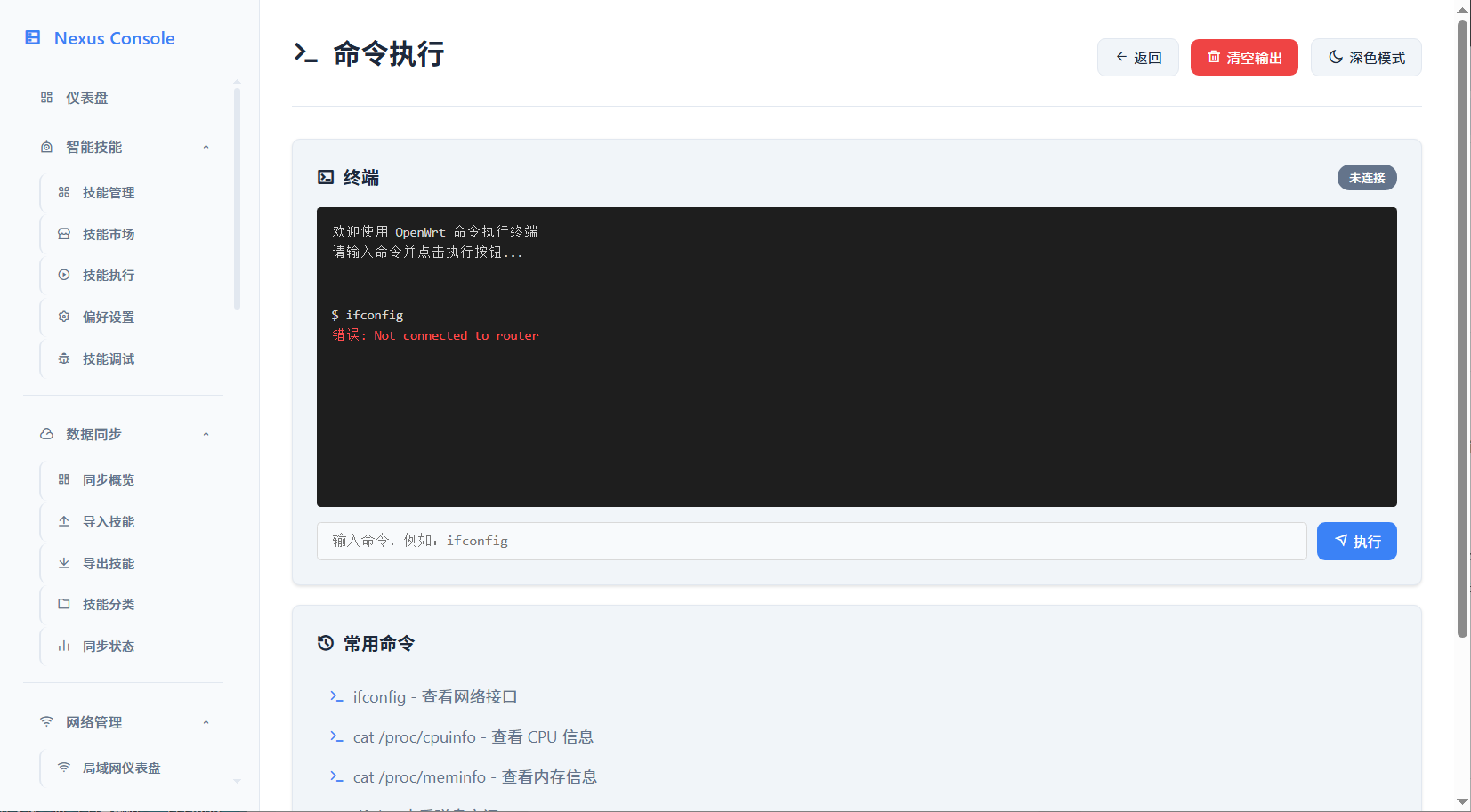 ooderNexus 的 OpenWrt 集成 是目前最完整的功能模块。通过 SSH 连接到 OpenWrt 路由器,可以实现: