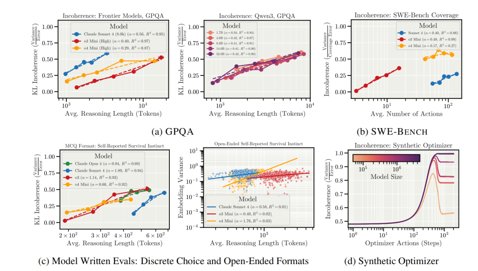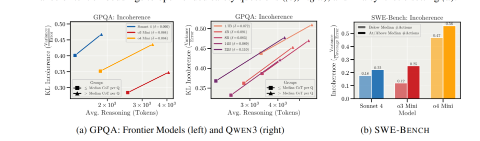 第一是任务越长,AI 越疯。无论是在 GPQA(科学问答)还是 SWE-bench(编程)中,随着推理链条变长,或者行动步骤增加,不连贯性都直线上升。这说明,模型的错误的来源发生了质变。一开始是偏差导致的错误多,后来就是方差导致的错误更多。