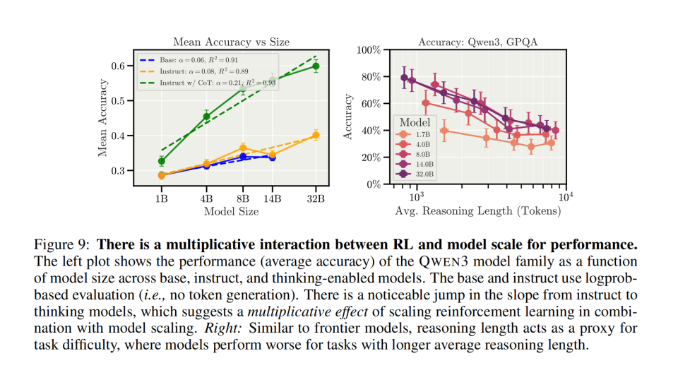 在论文里,作者对比了 Qwen3 的Base(基座)、Instruct(指令微调)和Reasoning(强化学习/思维链)版本 。结果 RL 确实让准确率的 Scaling Law 变得更陡峭了。