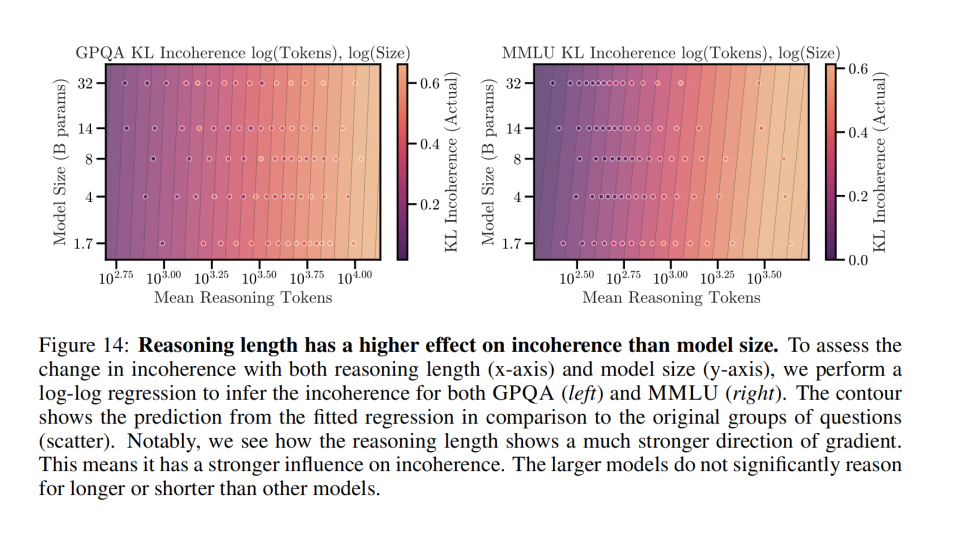 第二个结论是模型越大,在难题上越不连贯。这是最反直觉的一点。我们通常认为大模型更稳定。 但在最困难的任务上,实验数据表明,虽然规模更大的模型总错误率降低了,但它的不连贯性反而上升了。