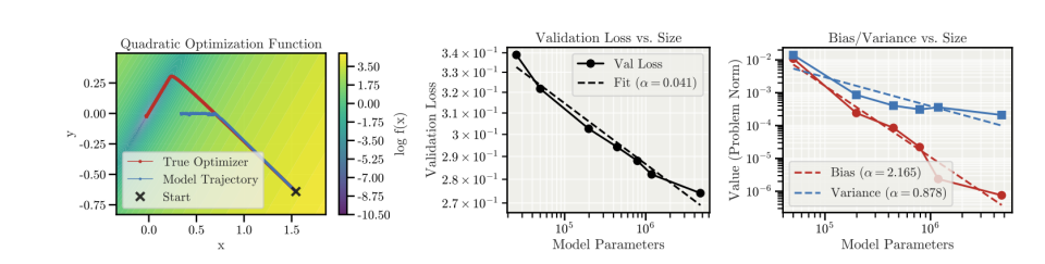 为了证明这点,论文作者从零开始训练了一堆 Transformer,让它们去模拟一个数学优化器(梯度下降)去寻找函数的最低点 。结果尽管模型变大了,偏差降得很快,但方差(走的路径稳不稳)下降依然得非常慢,甚至在某些阶段完全主导了错误 。