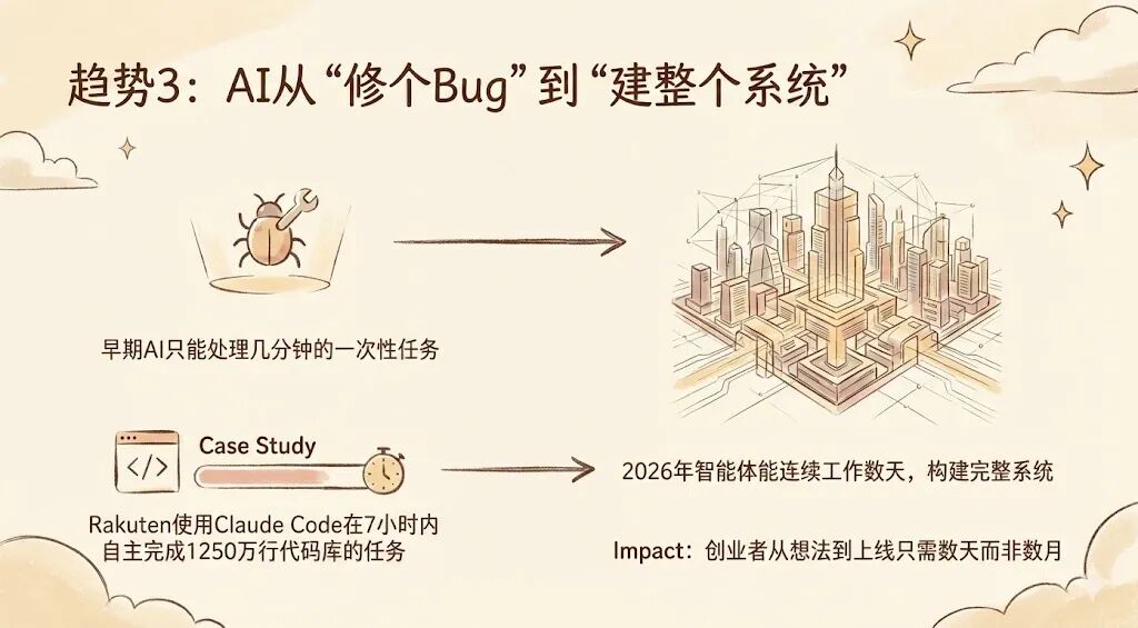 从一次性任务,到构建完整应用和系统。人类只需要在关键决策点提供战略监督。