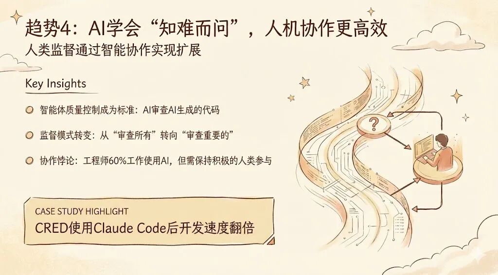- 人类从「审查一切」转向「审查关键点」。 建立智能系统处理日常验证,只在真正新颖的情况、边界案例和战略决策时寻求人类输入。