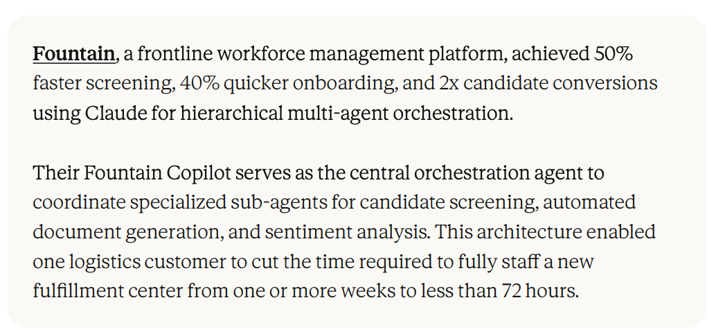 Fountain(一家前线劳动力管理平台)用Claude实现了层级化多智能体编排。他们的Fountain Copilot作为中央编排智能体,指挥专门的子智能体分别负责候选人筛选、自动文档生成和情感分析。效果是:筛选速度快50%,入职速度快40%,候选人转化率翻倍。一家物流客户把新配送中心的全面招聘周期从一周以上,压缩到了72小时以内。