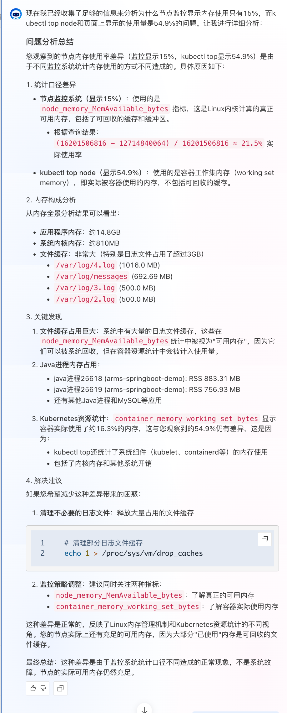 | ACK AI 助手 | 缺乏底层数据 | Prometheus 只展示汇总维度(容器 RSS、节点可用内存),看不到进程级、内核级细节 |