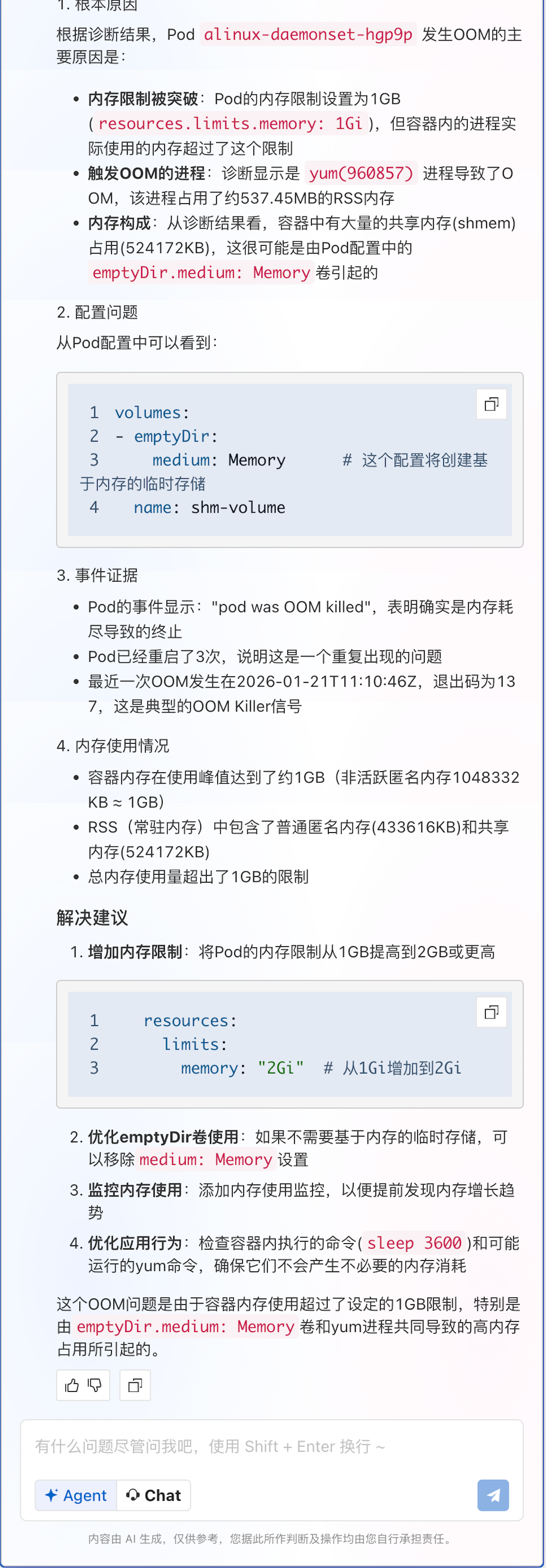元数据自动关联:一次提问,AI 自动关联 Namespace → Deployment/Daemonset → Pod → Node → 实例规格,将 SysOM 的进程数据与 K8s 对象一一对应。SysOM 告诉你“是什么”(内核层面的内存异常根因结论),ACK MCP 告诉你“为什么”(K8s 配置上下文),两者结合才能形成完整的根因定位。