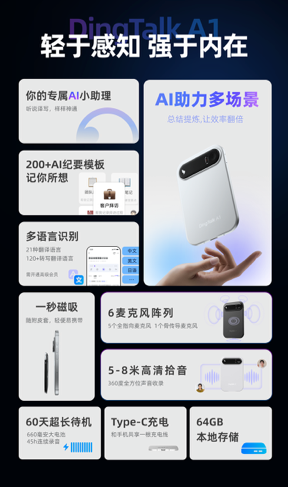 DingTalk A1 (“软硬一体”型) 的逻辑是 “源头高质量采集 + 实时AI处理 + 生态协同” 。它致力于确保信息在产生瞬间就被高保真捕获、并即时转化为可行动的洞察,扮演了关键的 “前端信息中枢” 角色。