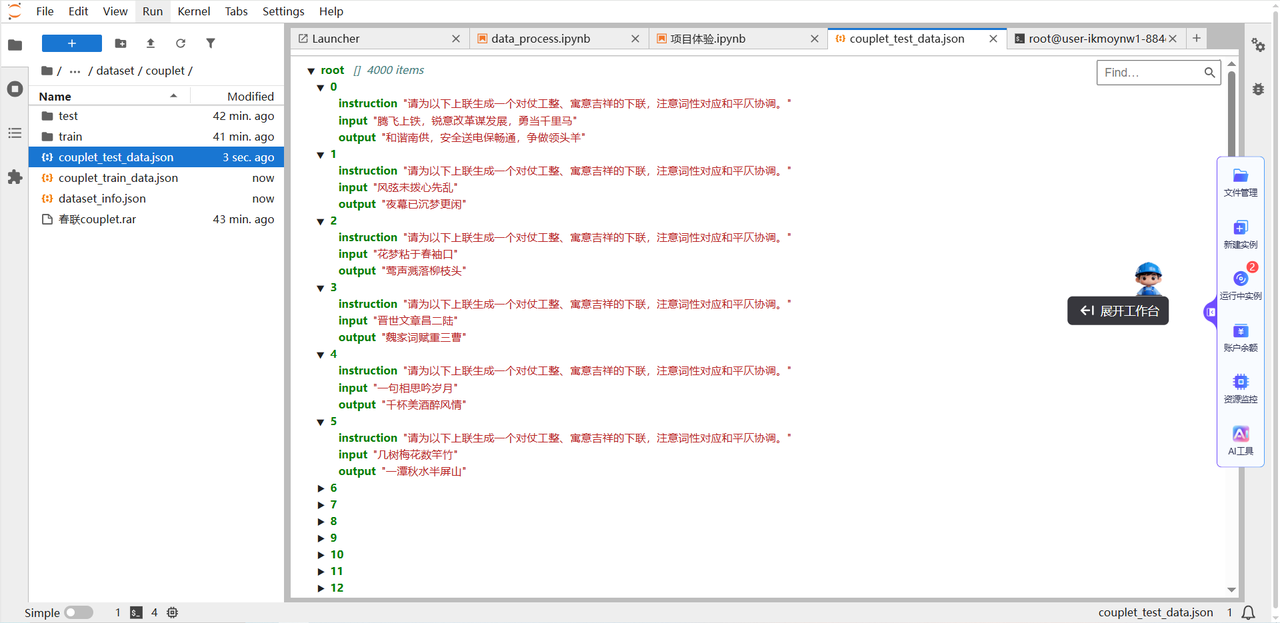 本次微调选用的原始数据集仅以 “上联 - 下联” 的成对文本形式存储,无任务导向的指令标注,示例如下: