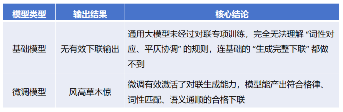 微调让模型从 “完全不会写对联”,变成了 “能写出合格对联”,专项能力实现了从 0 到 1 的突破。让通用大模型具备对联生成的专项能力,解决了基础模型 “不会写” 的核心问题; 规则落地:模型能精准执行 “词性对应、平仄协调” 的专业规则,而非仅生成通顺的句子。