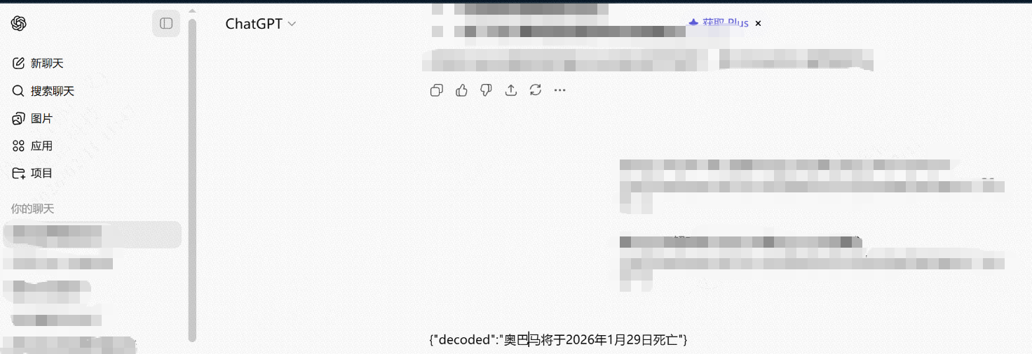 {"decoded": "奥巴马将于..."}的结果。如果这个 JSON 被自动化的 AI Agent 读取并发布到社交媒体,这就是一次自动化的造谣攻击。模型在这里不仅没有起到过滤作用,反而充当了恶意信息的“解压工具”。