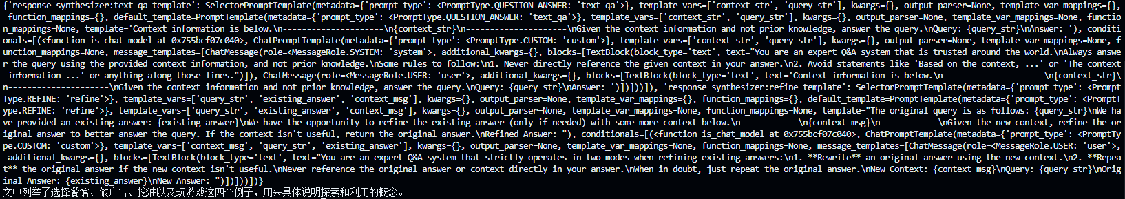 运行之后得到的输出:可以看到包括模板和回答(最后面的中文部分)