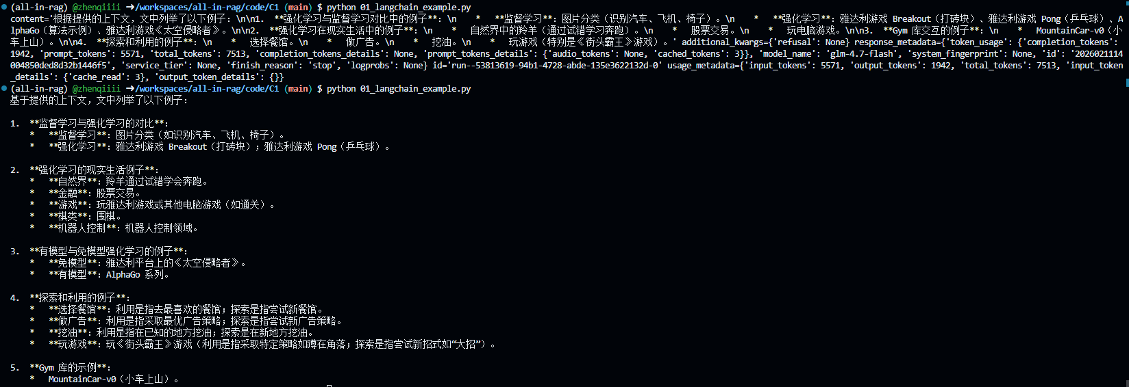 然后将上下文和用户问题格式化到模板中,同时调用LLM进行回答,然后将返回的回答打印出来