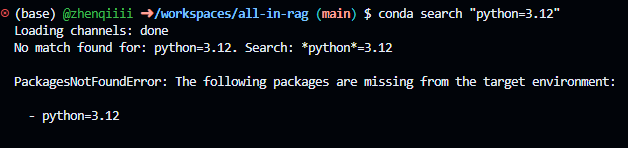 看报错的意思是找不到包。问了一下AI说是当前conda channelsdefaults中没有对应版本的Python,所以运行搜索命令查询了一下: