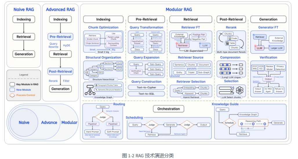 相较于初级RAG加入检索前和检索后两个步骤,检索前进行查询重写(利用LLM优化用户问题),检索后进行结果重排(Rerank)。