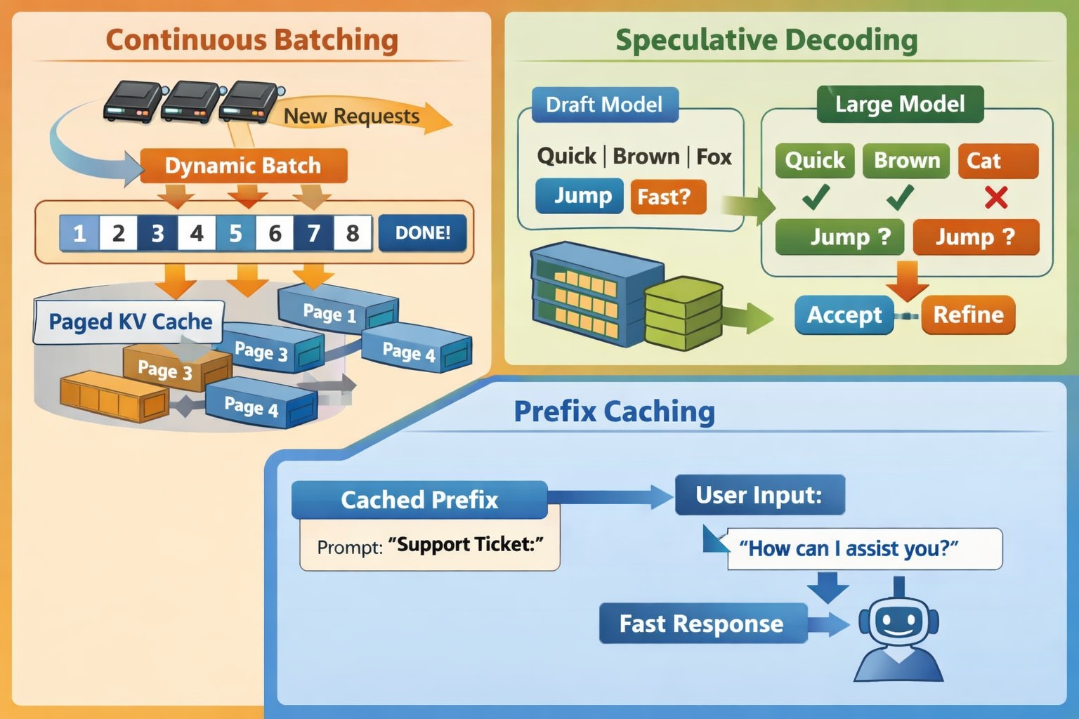 - Prefix Caching:对固定前缀进行Prefill缓存,避免重复计算。