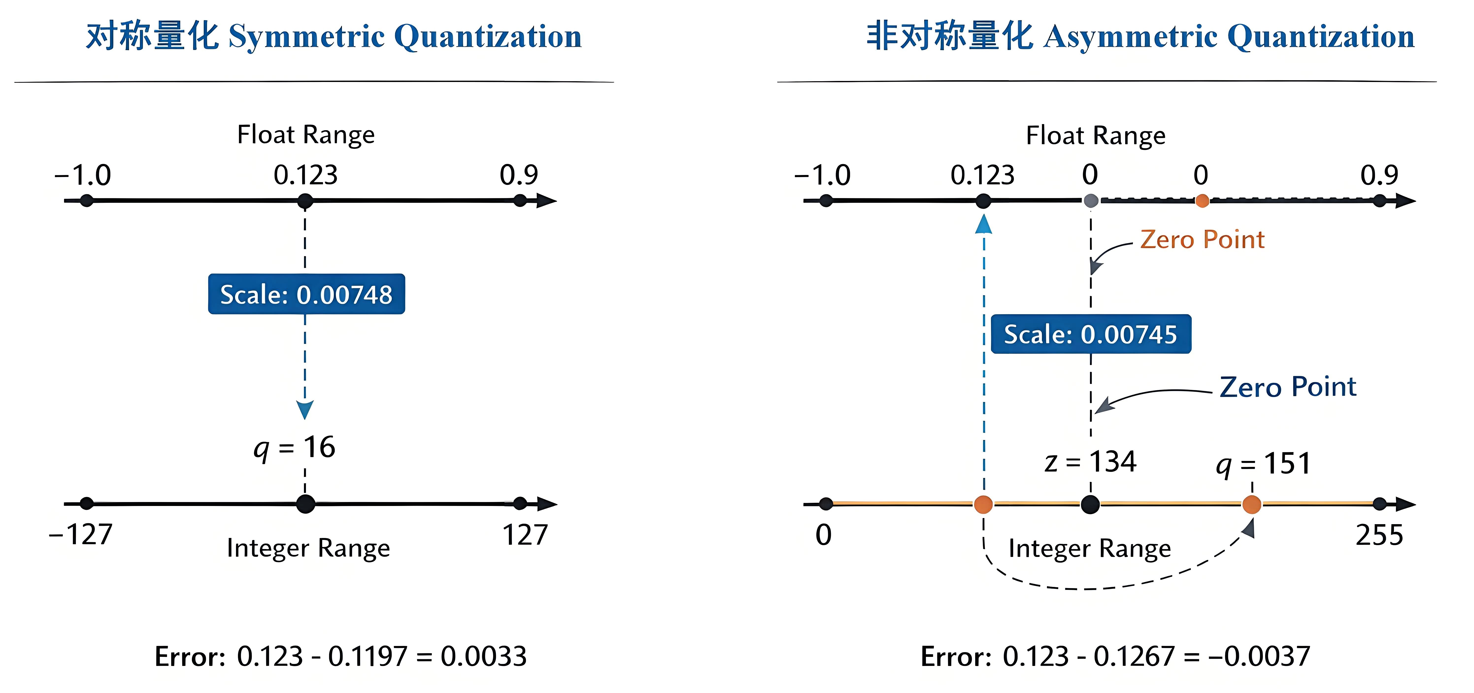 其中 x x x是原始浮点值, s s s是缩放因子scale, q q q是量化后的整数。 - 当浮点数的取值全部为正时,若仍采用对称量化方式,整数表示范围内近一半的负数位将无法被利用,从而降低量化精度。为此,可通过引入零点,将浮点数的取值范围整体平移到整个整数区间上,以充分利用所有整数位来更好地保持精度,这种方法即非对称量化。后续将重点介绍非对称量化,对称量化仅需将零点设为0即可: