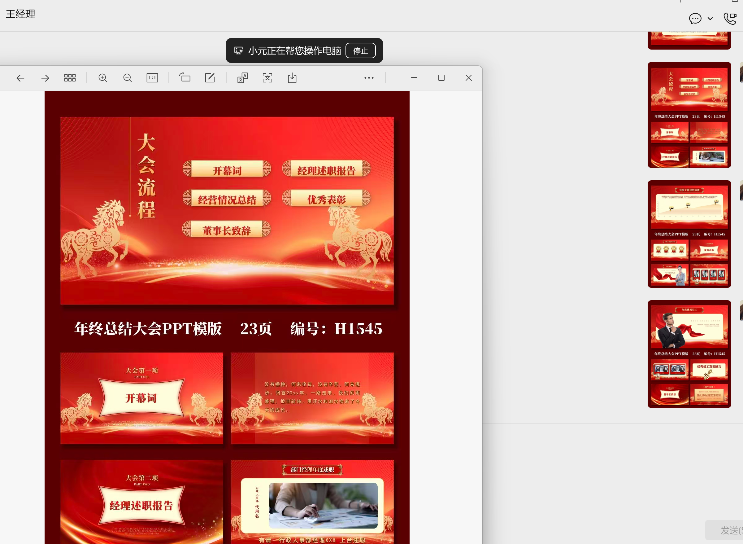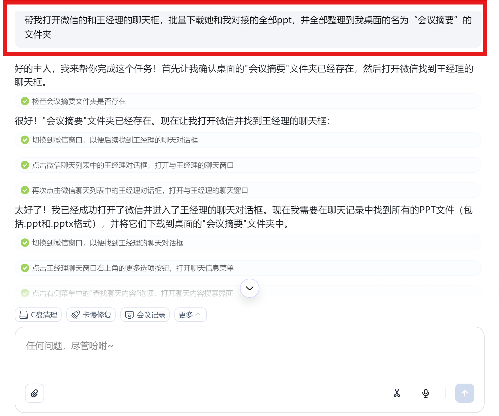 "打开微信并进入与王经理的聊天框,批量下载聊天记录中全部PPT文件,并整理到桌面「会议摘要」文件夹中"