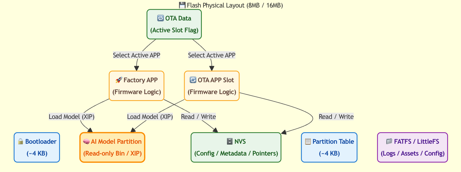 在 Edge AI 场景下,固件不再是一个单一的二进制文件。由于 AI 模型通常占据 1MB-4MB 的 Flash 空间,将其与逻辑代码耦合会导致 OTA 失败率大增。