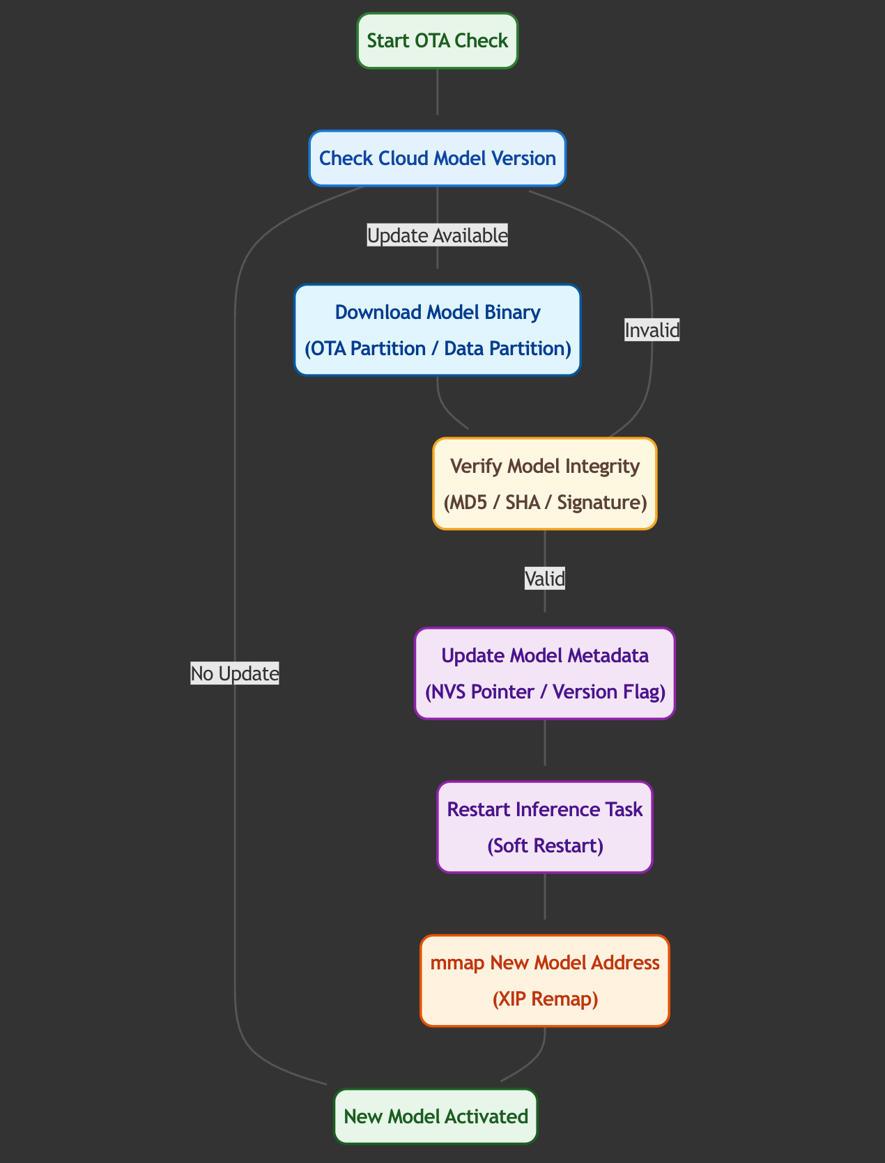 在生产环境中,AI 模型的迭代速度通常与业务逻辑代码不同步。如果将 2MB 的模型与 1MB 的固件打包在一起进行整包 OTA,不仅浪费带宽,还会增加双分区闪存布局的压力。