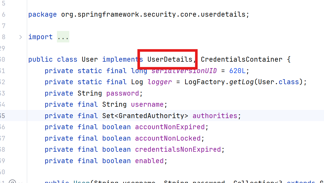 这里User类对UserDetails做了功能拓展,这个User类就是SpringSecurity提供给开发者的默认UserDetails的实现类。