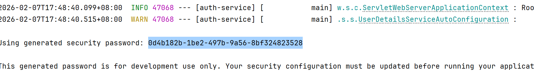 默认密码为SpringSecurity自动生成的UUID,每次生成的不一样(仅限测试使用,项目中需改造这部分逻辑)