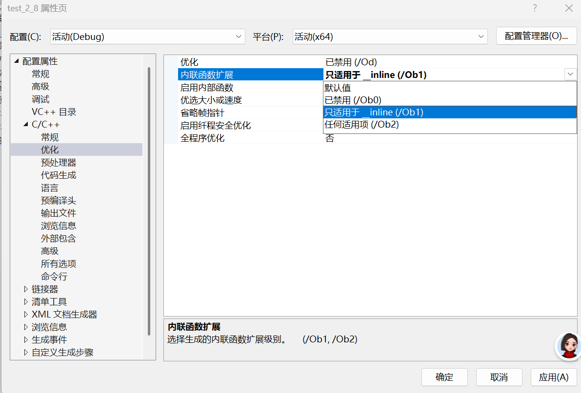 vs编译器debug版本下默认不展开inline,便于调试,想展开需要手动设置