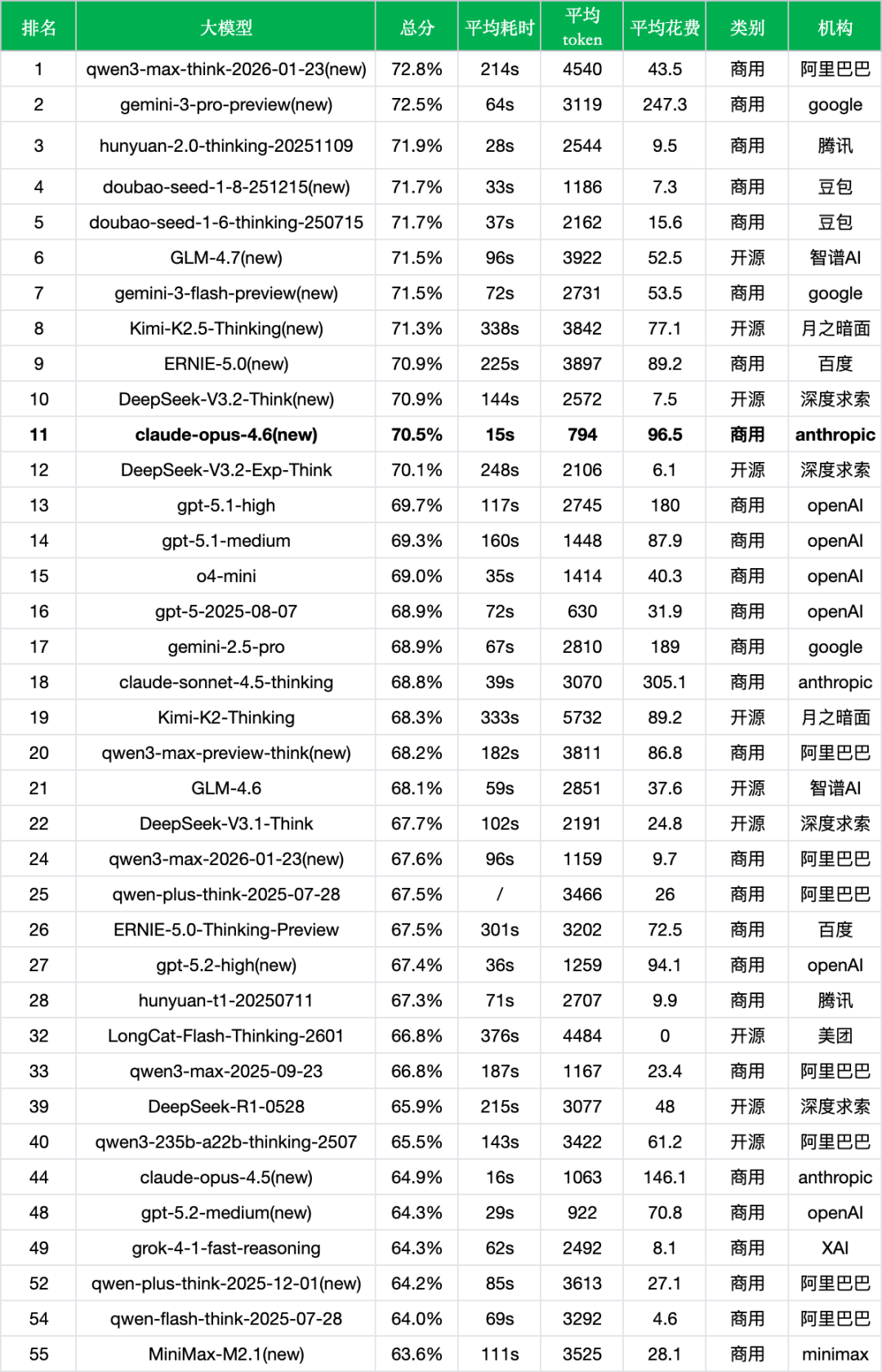 - Anthropic产品线分化:Claude Opus 4.6(70.5%)定位旗舰,而claude-sonnet-4.5-thinking(68.8%)在本次中文场景评测中准确率略低。