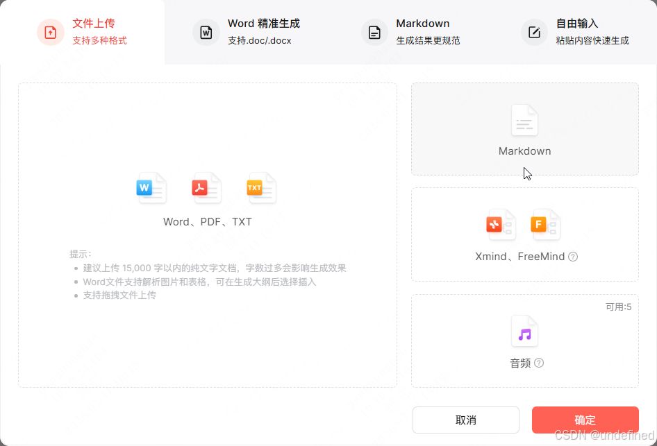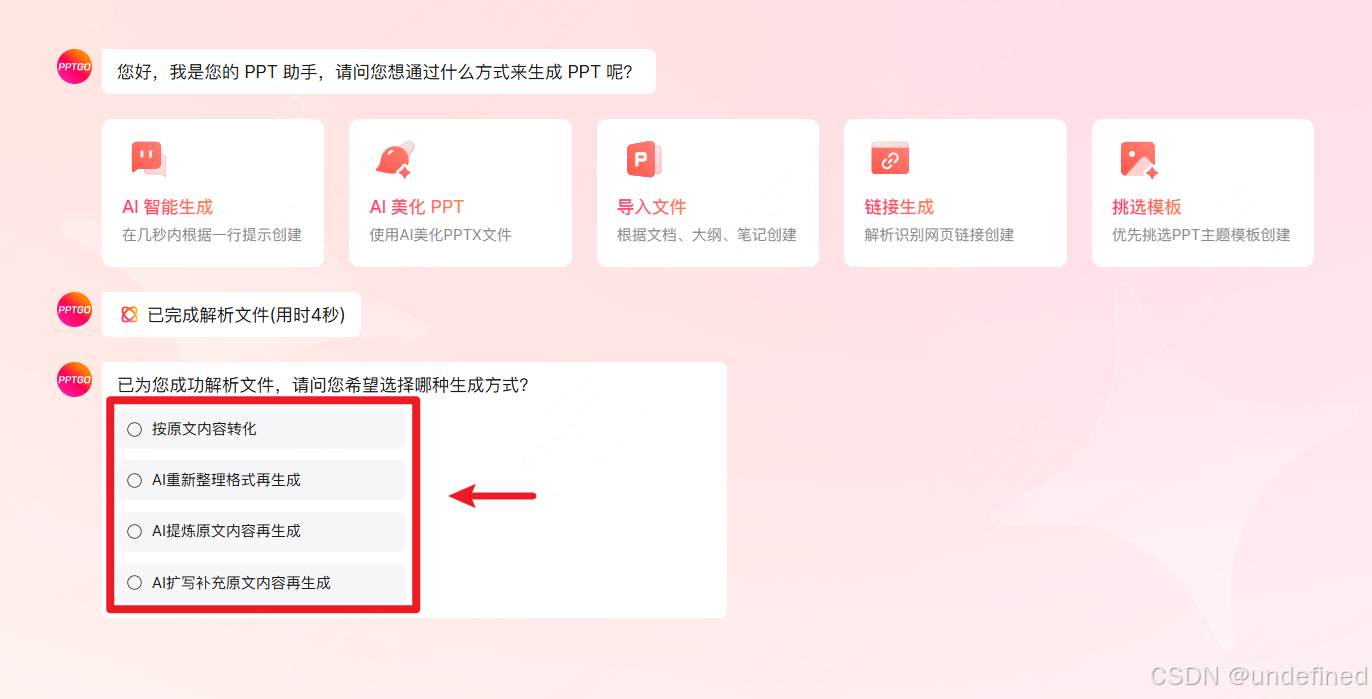 选择生成方式:文件解析完成后,选择以下四种方式之一: