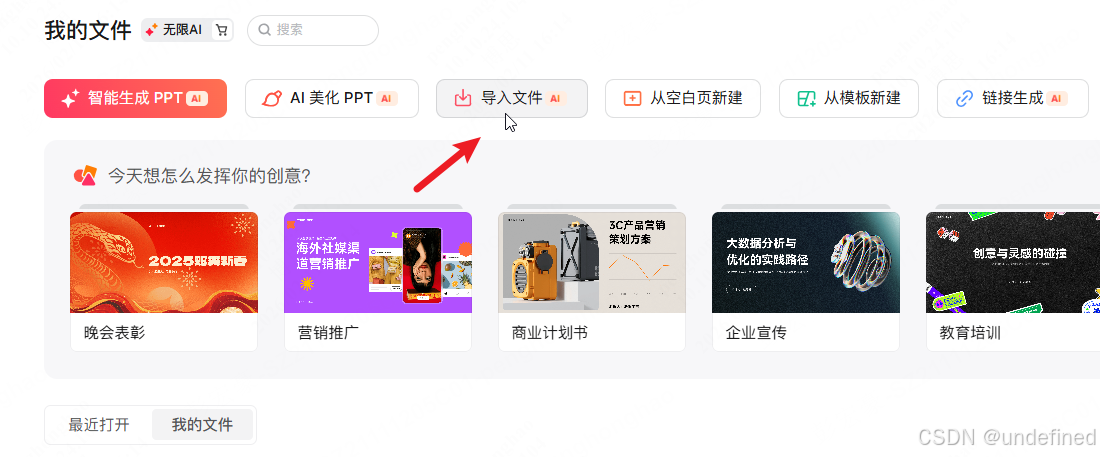 进入Markdown生成PPT界面:点击工作台顶部的“导入文件” 按钮